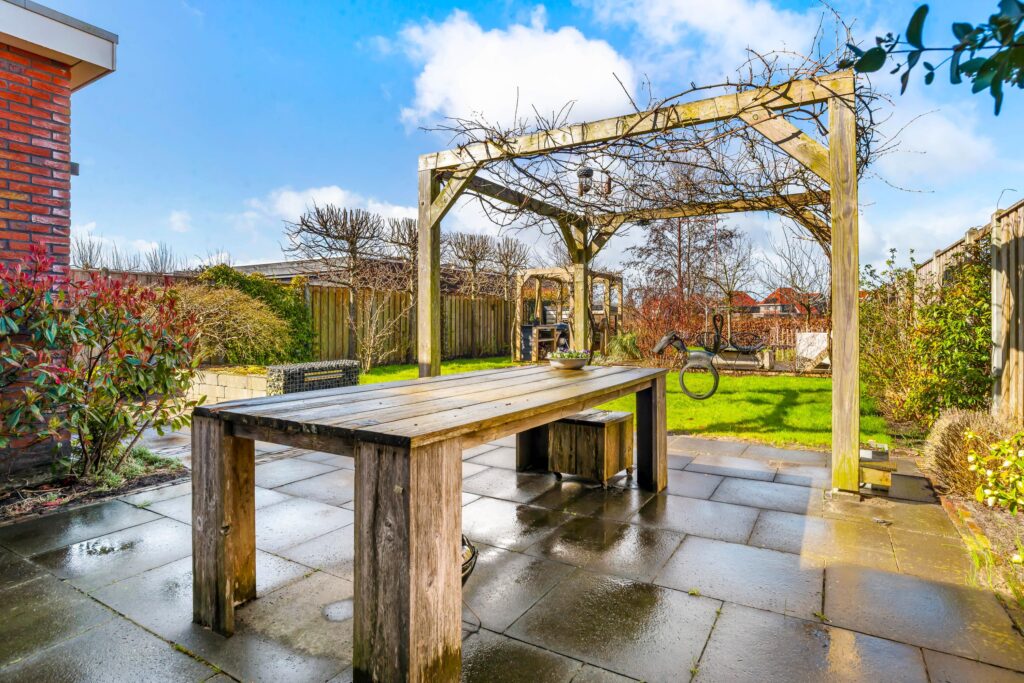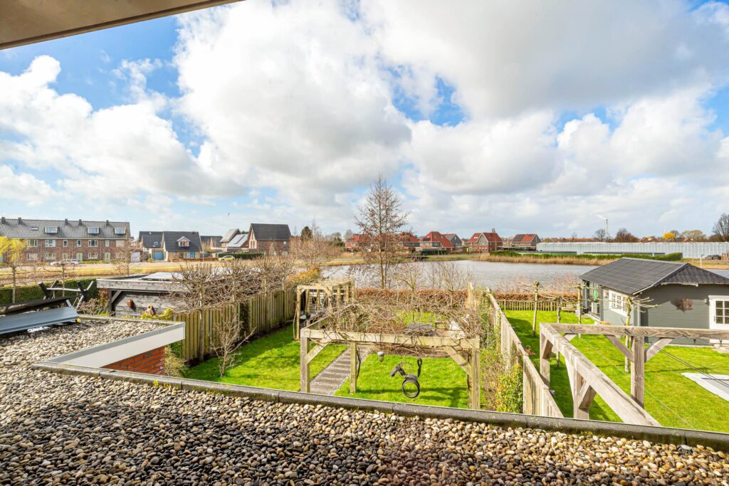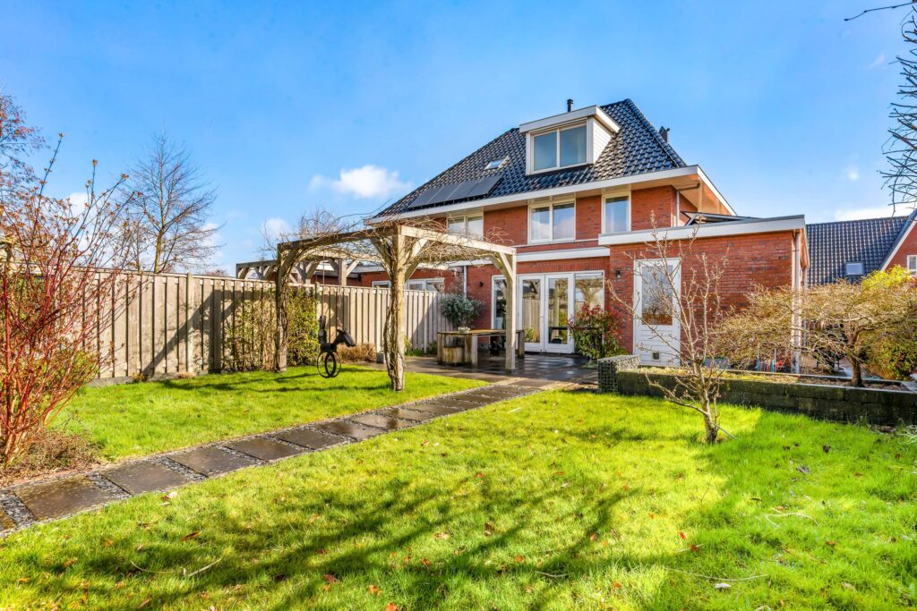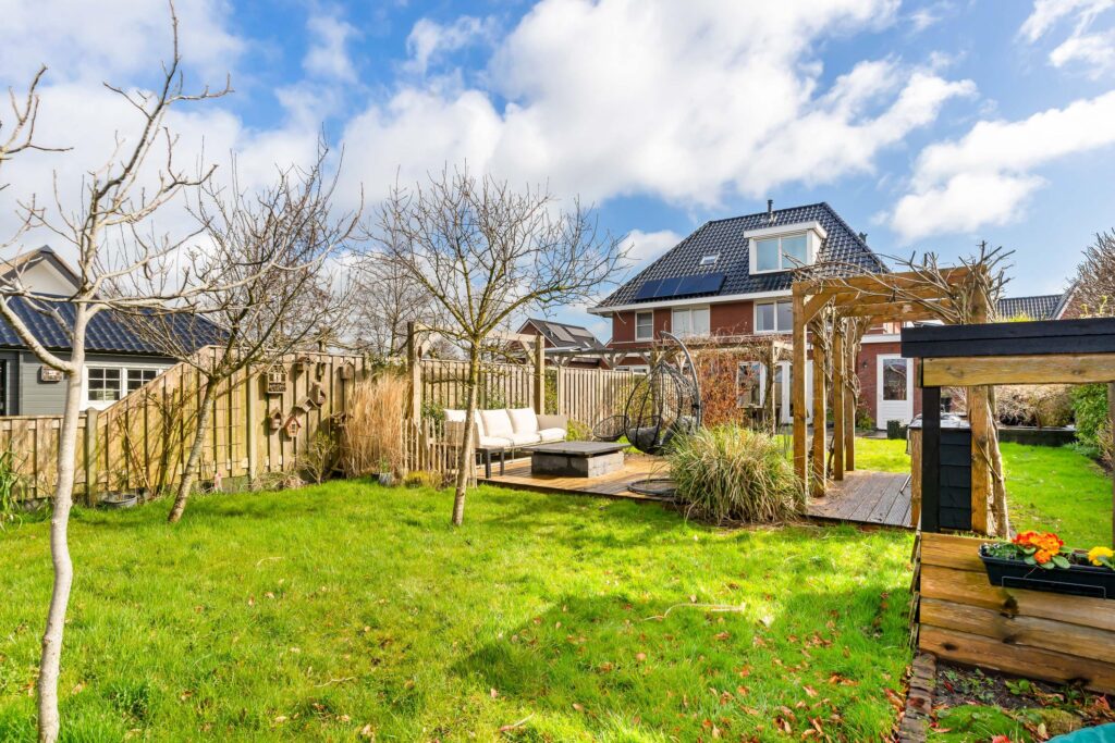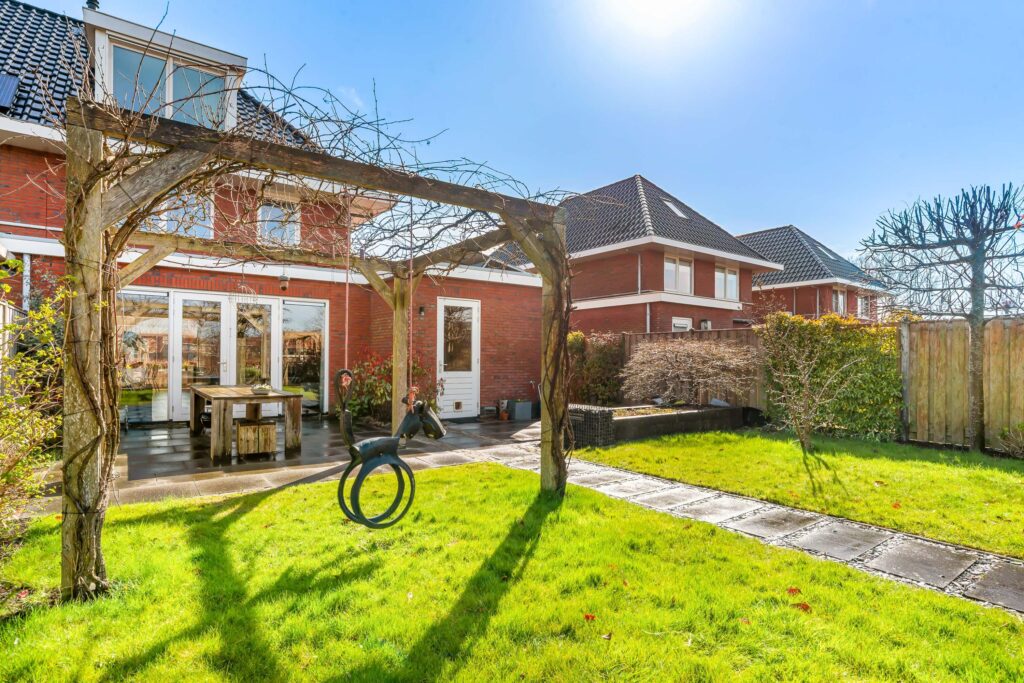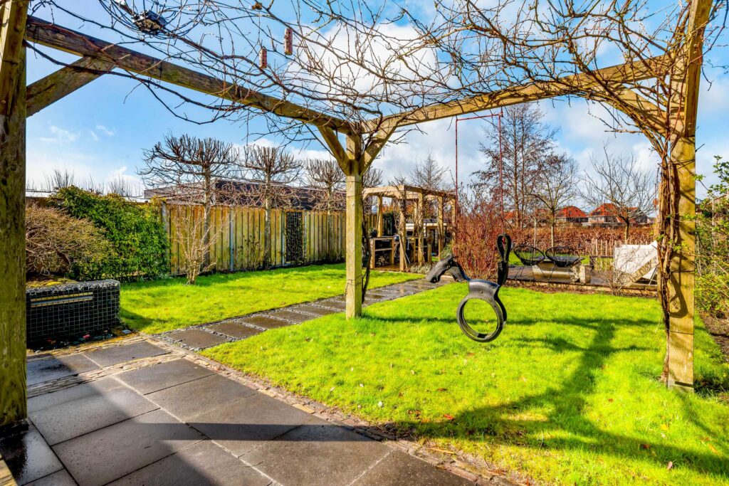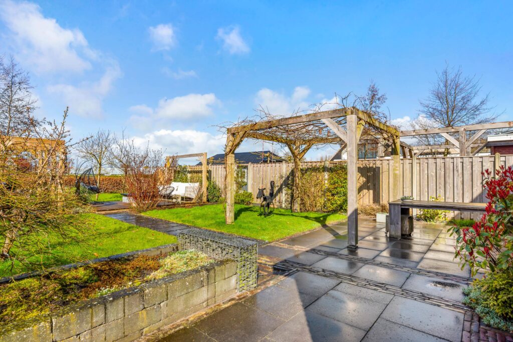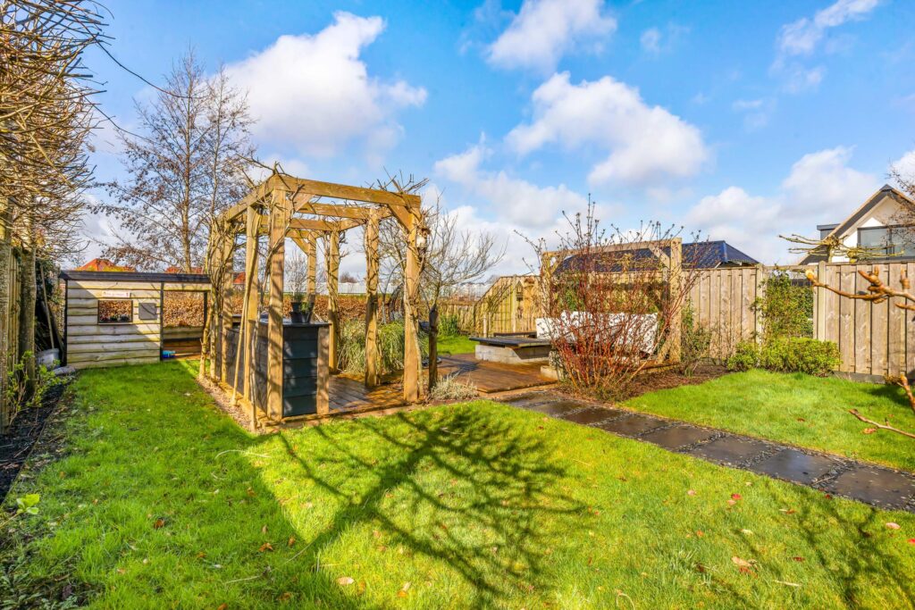 De achtertuin is met zorg en oog voor detail aangelegd en biedt meerdere plekken om te ontspannen, te zonnen of gezellig te barbecueën met familie en vrienden. Pergola’s zorgen voor natuurlijke schaduw op warme dagen, terwijl de combinatie van groen, bomen en een ruim gazon een oase van rust creëert. Tussen de tuin en de plas ligt een circa 4 meter breed pad, wat zorgt voor extra privacy en een vrij gevoel.