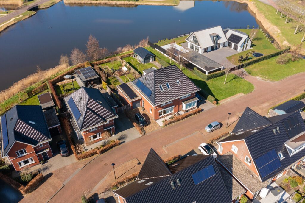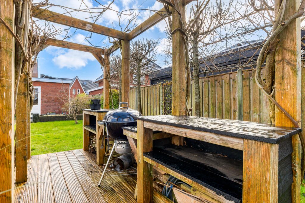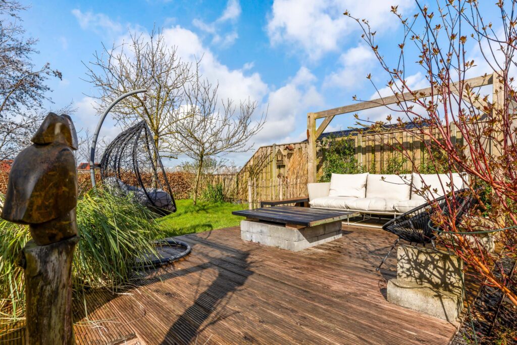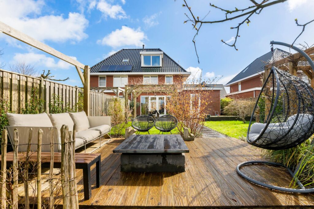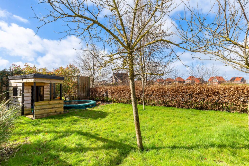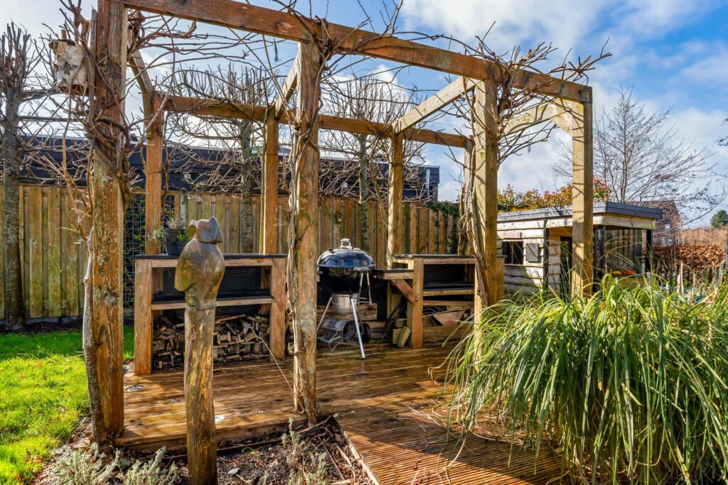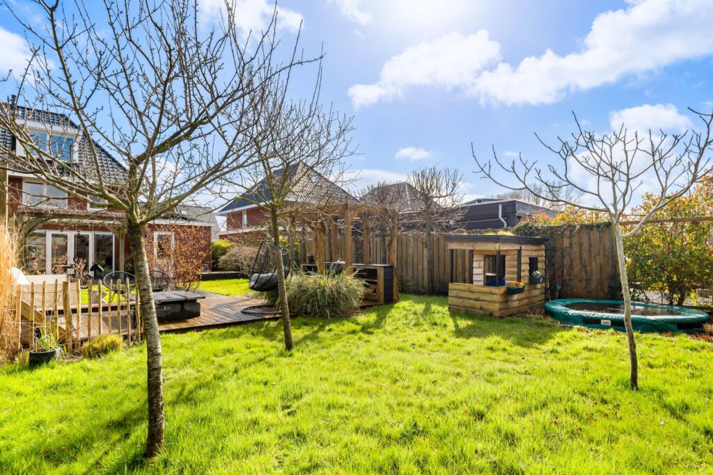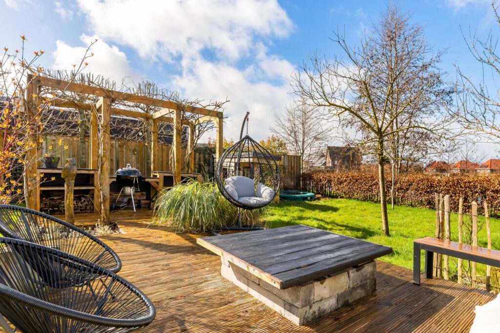 De achtertuin is met zorg en oog voor detail aangelegd en biedt meerdere plekken om te ontspannen, te zonnen of gezellig te barbecueën met familie en vrienden. Pergola’s zorgen voor natuurlijke schaduw op warme dagen, terwijl de combinatie van groen, bomen en een ruim gazon een oase van rust creëert. Tussen de tuin en de plas ligt een circa 4 meter breed pad, wat zorgt voor extra privacy en een vrij gevoel.