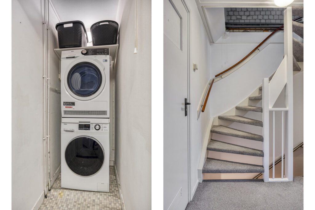 Praktische wasruimte met aansluitingen voor wasapparatuur en mogelijkheid voor een was/droog-combinatie.