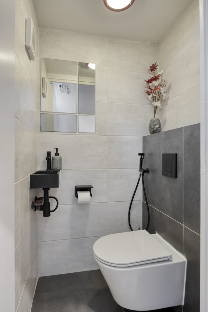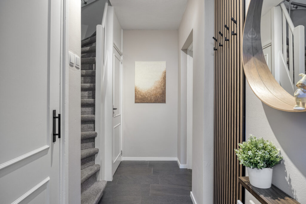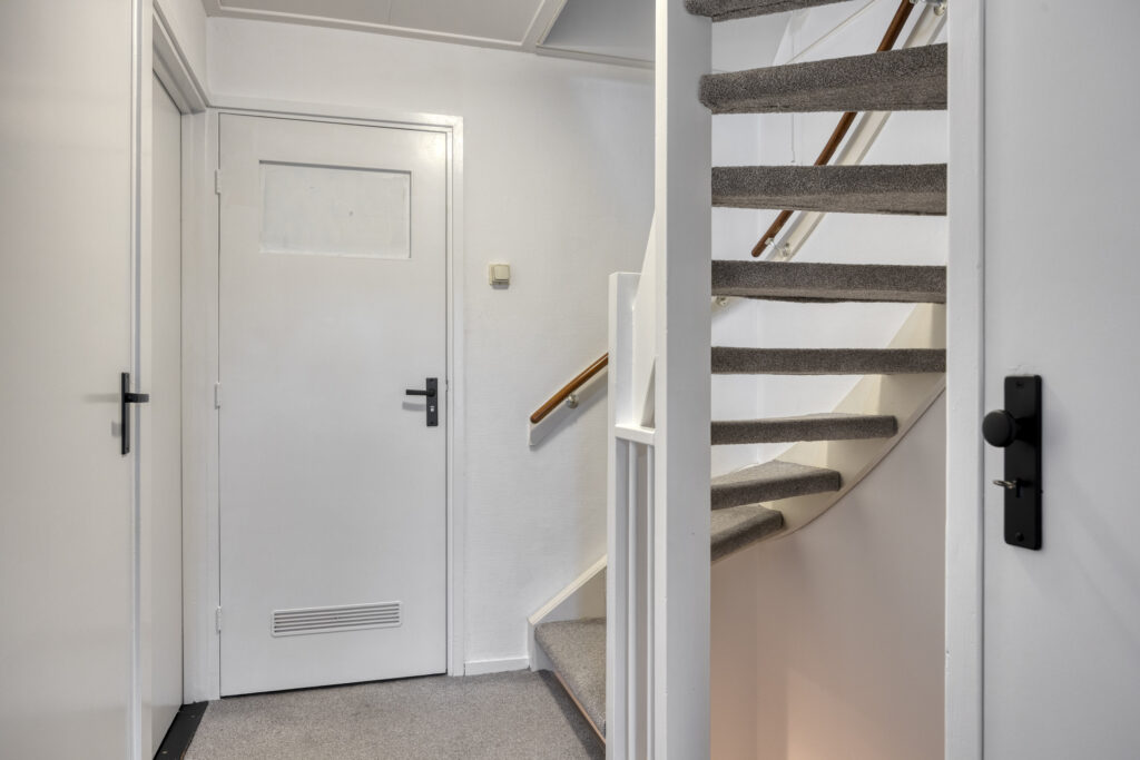Lichte hal met garderoberuimte en praktische bergkast. Modern betegeld toilet (2021) met closet. Verdiepte trapkast met veel bergruimte en vernieuwde metervoorzieningen (2022). Recent vernieuwde trapbekleding naar de eerste verdieping.