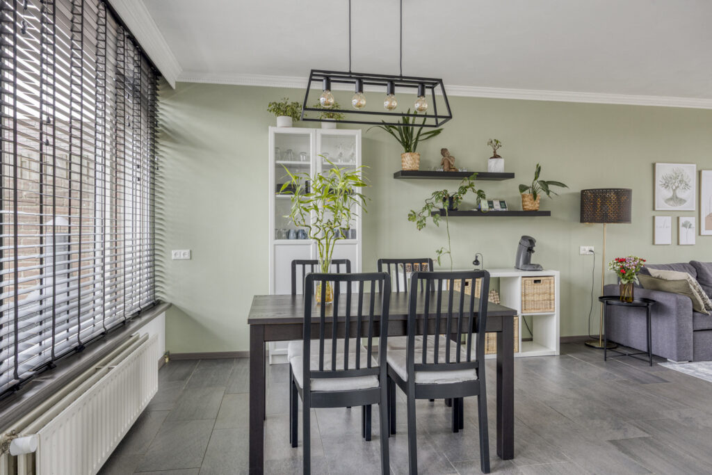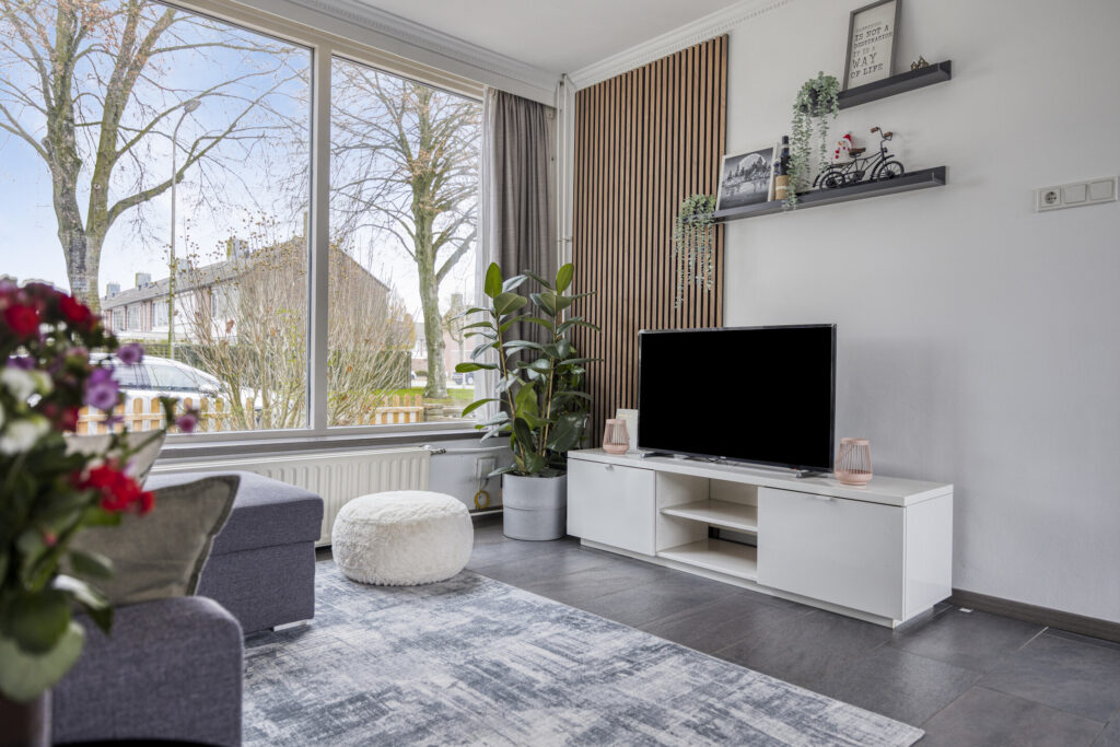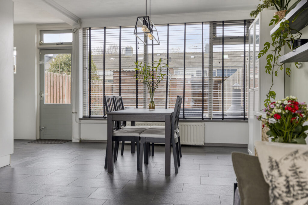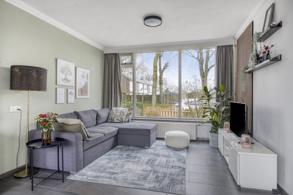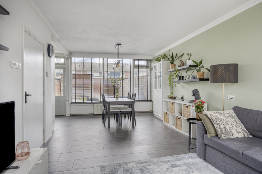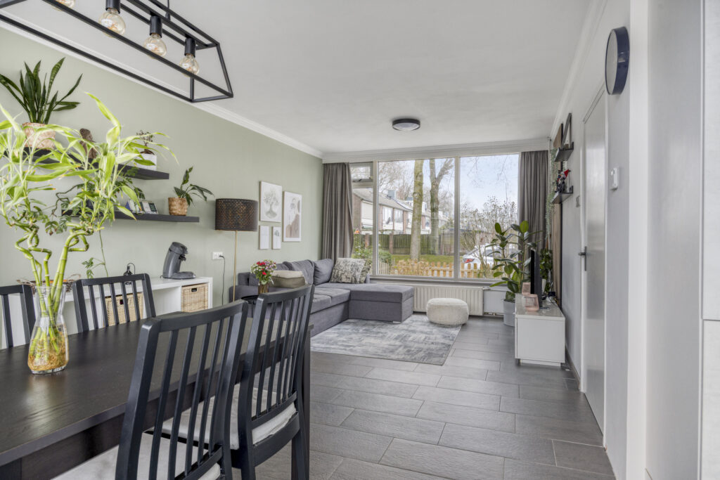 Ruime, moderne woonkamer met tegelvloer, strakke wanden en schuurwerk plafond. Dankzij de grote ramen aan voor- en achterzijde geniet je van veel lichtinval en een prettige, vrije blik op het plantsoen aan de voorzijde. De open verbinding met de keuken versterkt het ruimtelijke gevoel.
