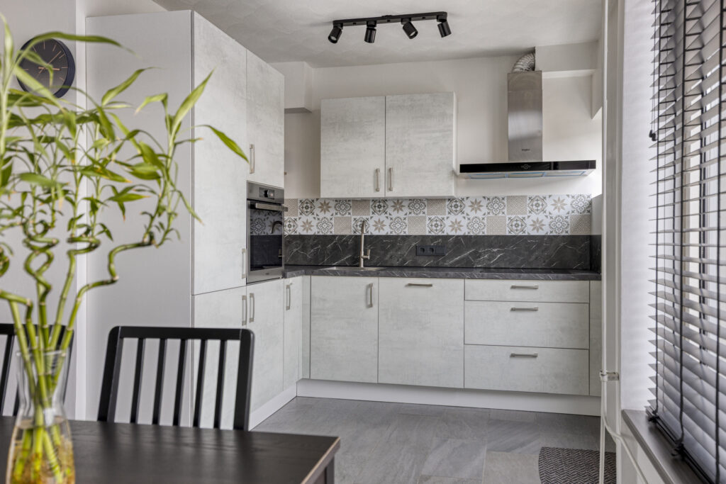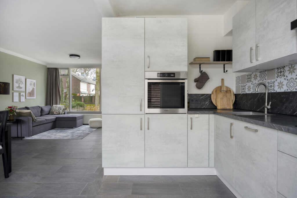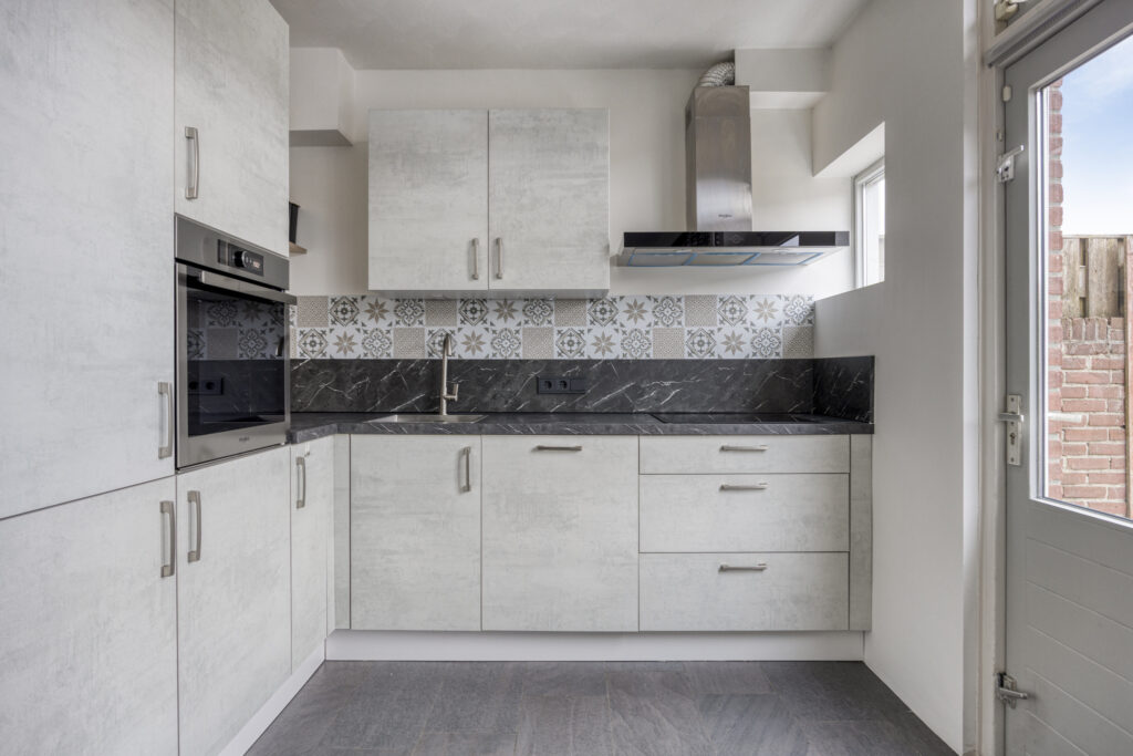 Semi-open keuken aan de tuinzijde, vernieuwd in 2022. Voorzien van voldoende kastruimte en toegang tot de achtertuin.