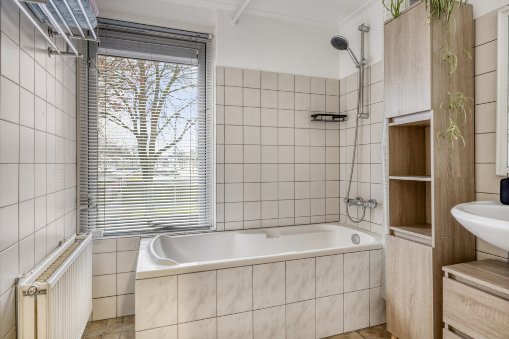 Basic badkamer, volledig betegeld met ligbad/douche, thermostaatkraan en wastafel.