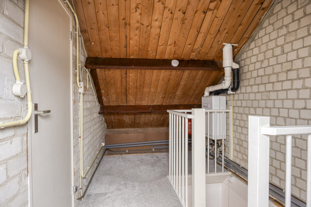 Ruime voorzolder met kunststof dakvenster (2020), volop bergruimte en de opstelling van de Intergas HR-ketel uit 2019.