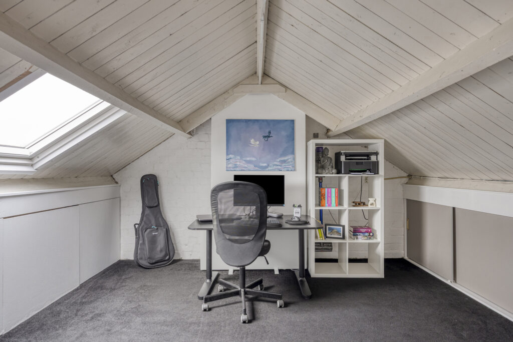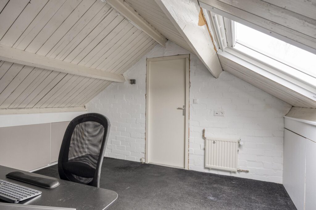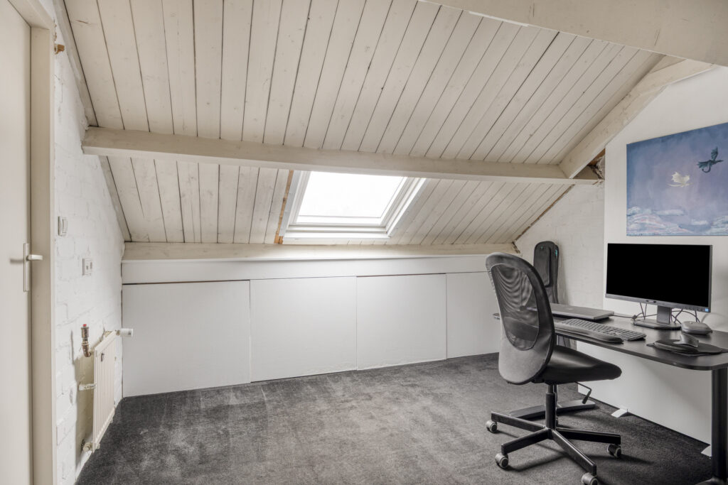 Grote zolderkamer met kunststof dakvenster (2020), fraaie vloerbedekking en extra bergruimte onder de schuine kap.