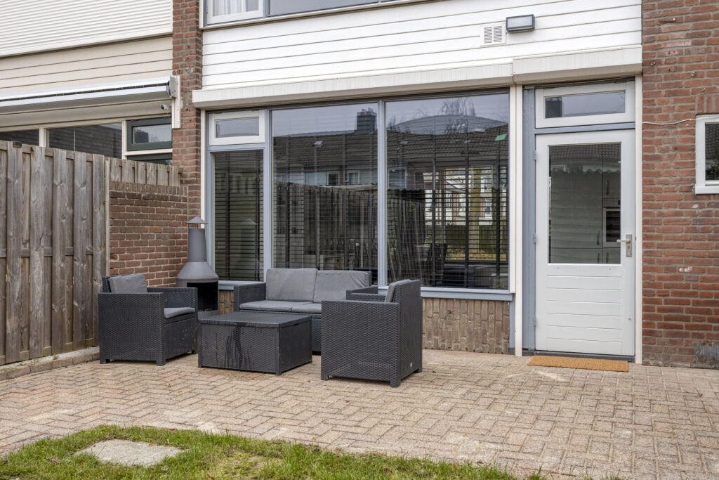 Onderhoudsvriendelijke, bestrate tuin met terras en plantenborder. Geniet hier van middag- en avondzon.