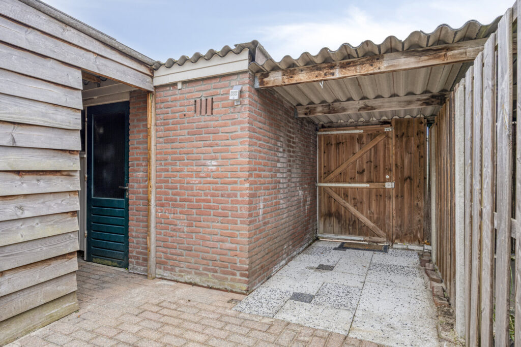 Stenen berging met elektra, extra houten opslag en een overdekte, afsluitbare achterom.