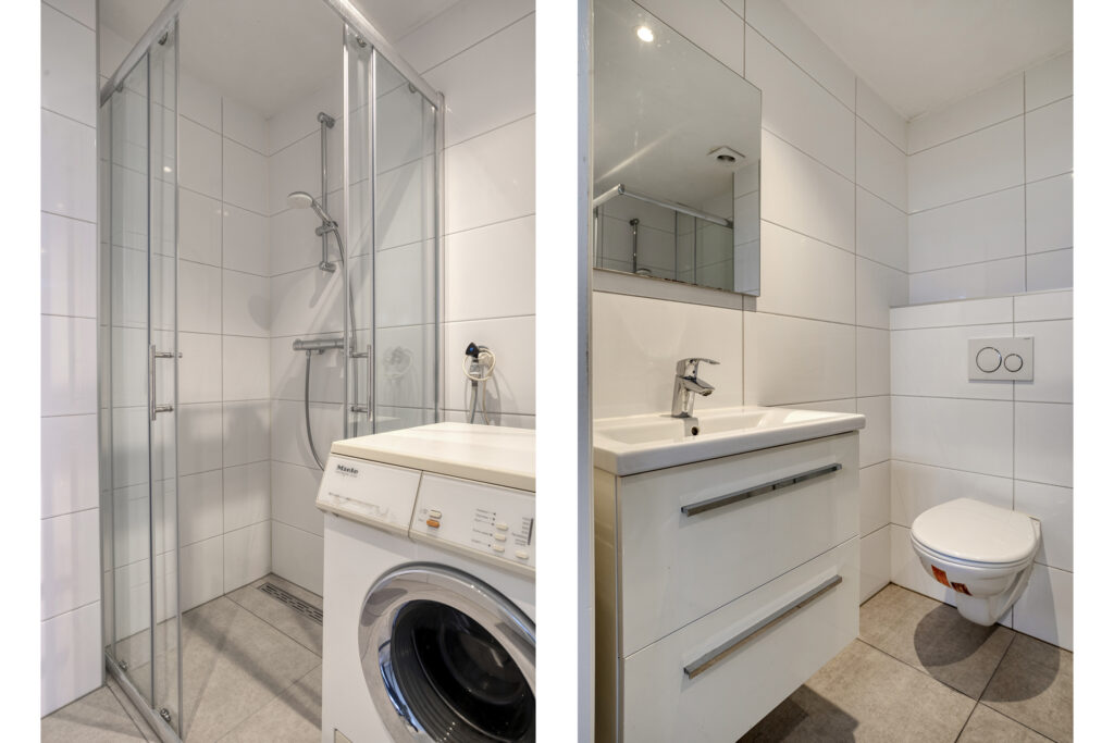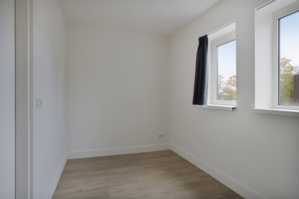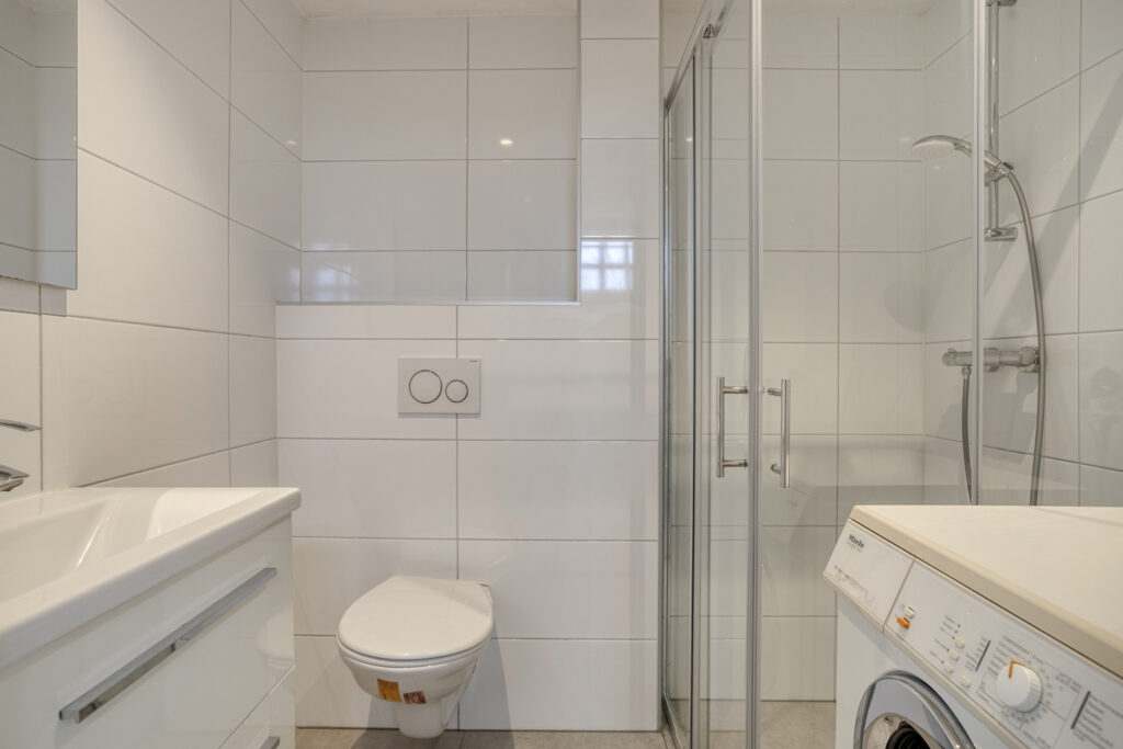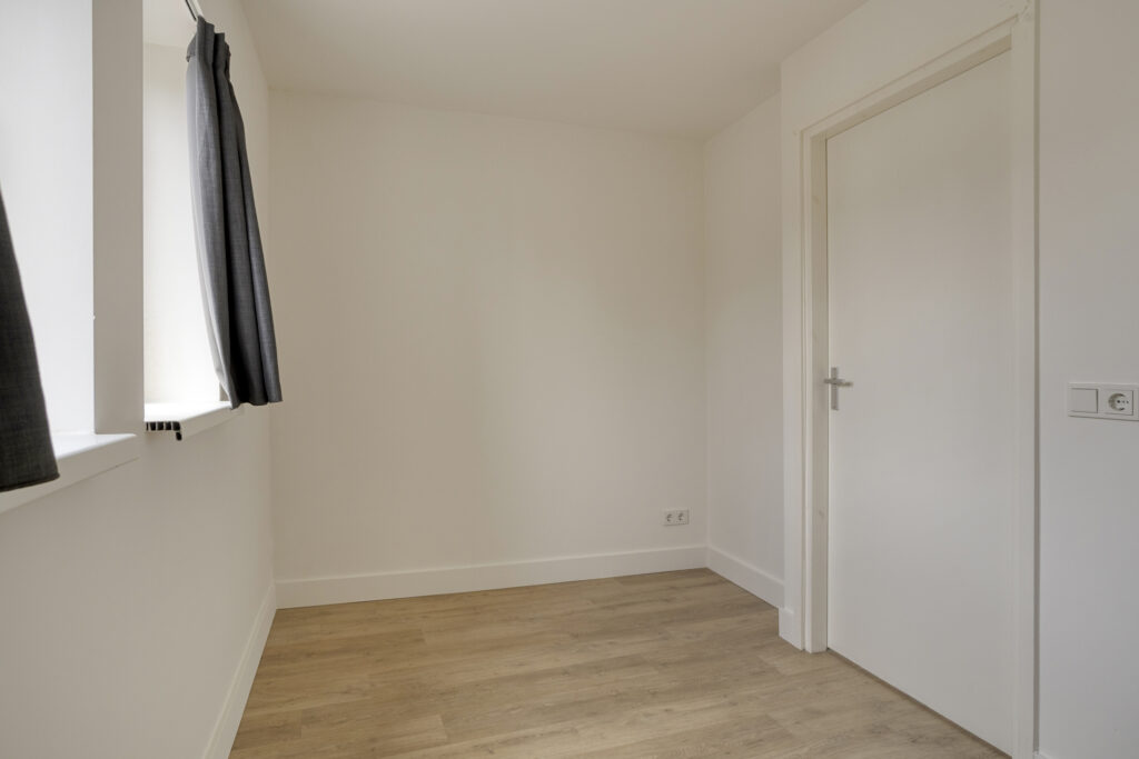De slaapkamer biedt een rustige plek om te ontspannen. De vernieuwde badkamer is voorzien van een moderne inloopdouche, wastafel en toilet.