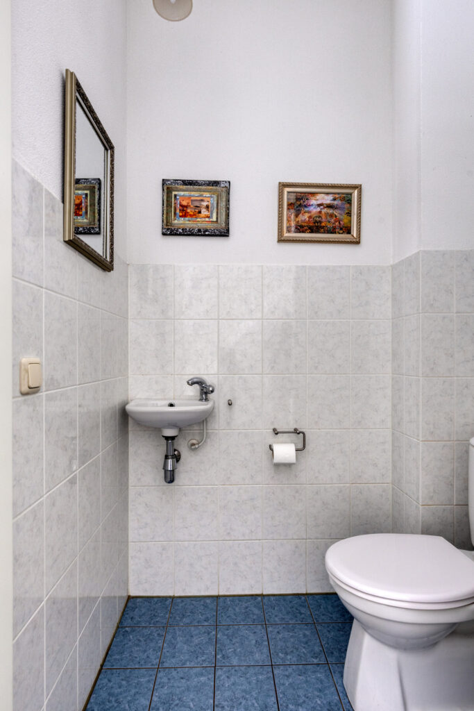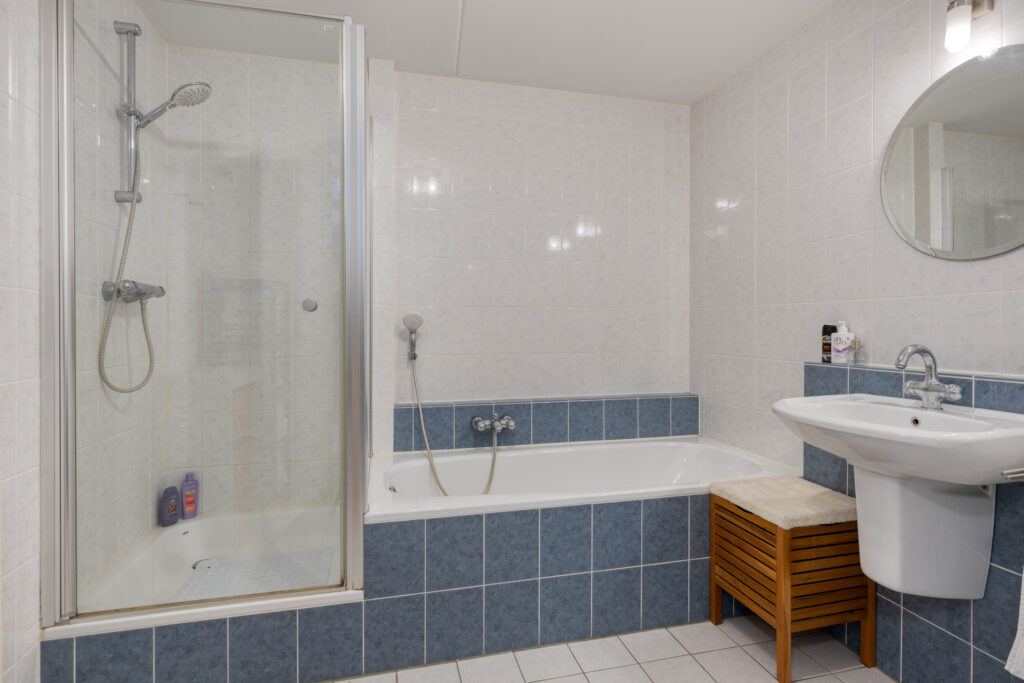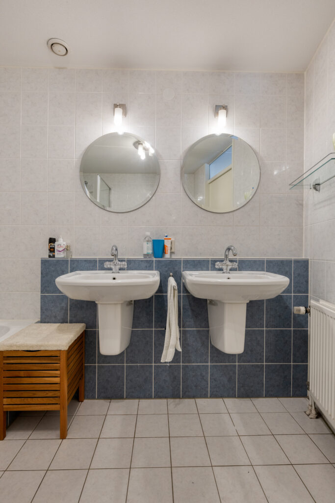 Hier bevinden zich twee slaapkamers, een aparte toiletruimte en de badkamer. De ruime badkamer is ingericht met een ligbad, douchehoek en een dubbele wastafel.