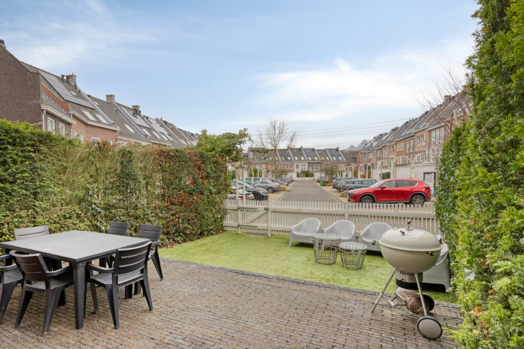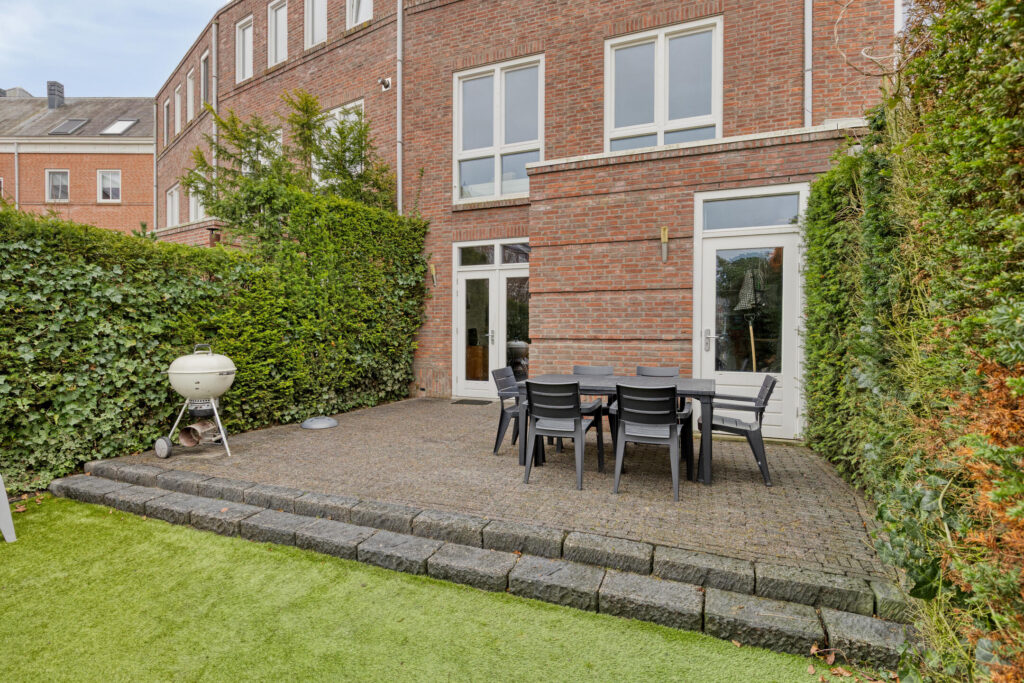 De achtertuin is onderhoudsvriendelijk aangelegd met sierbestrating en kunstgazon. Vanuit de tuin is er toegang tot de inpandige berging. De tuin grenst direct aan het achtergelegen parkeerterrein, waar zich de eigen parkeerplaats bevindt.