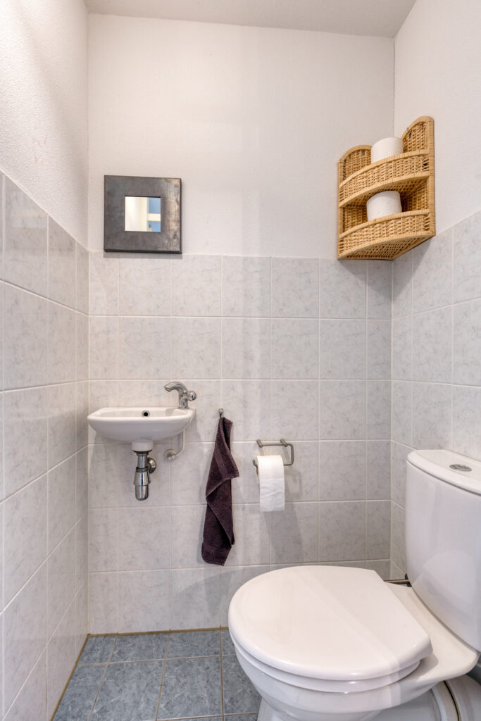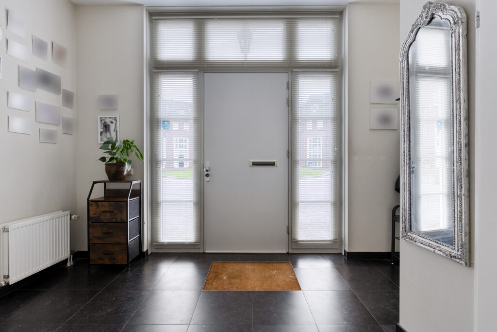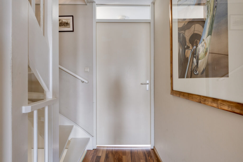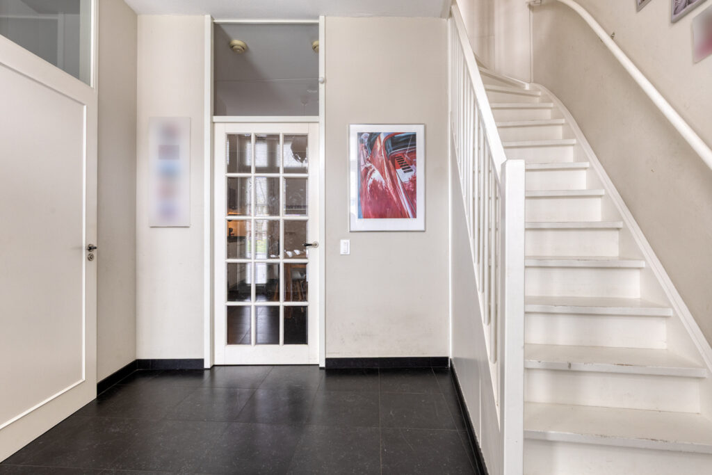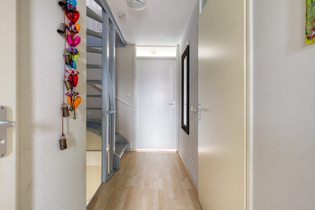 Ruime ontvangsthal met garderobe nis, meterkast en toiletruimte. Vanuit de hal bereik je via de trap de eerste verdieping. Ook loop je vanuit de hal door naar de woon-/leefkeuken welke zich op de begane grond bevindt.