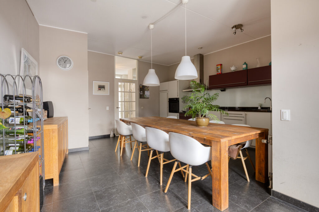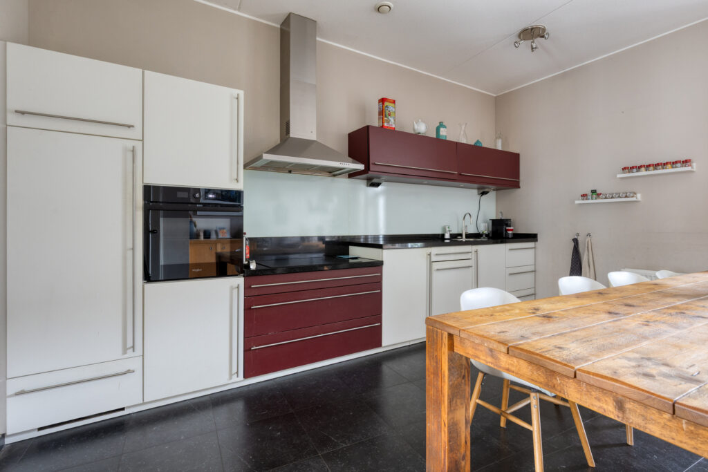 De royale woon-/leefkeuken bevindt zich op de begane grond en vormt een prettige leefruimte met veel mogelijkheden. De keuken is uitgevoerd in een wandopstelling en voorzien van diverse inbouwapparatuur. Aangrenzend bevindt zich een inpandige berging/bijkeuken. Via dubbele openslaande deuren is er directe toegang tot de achtertuin.