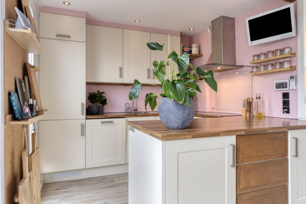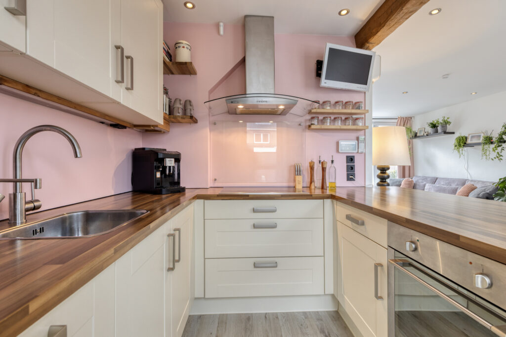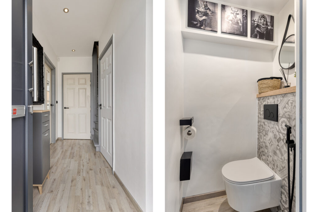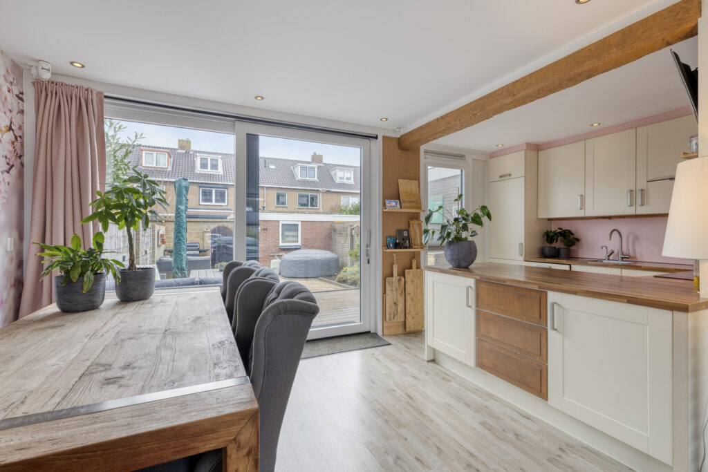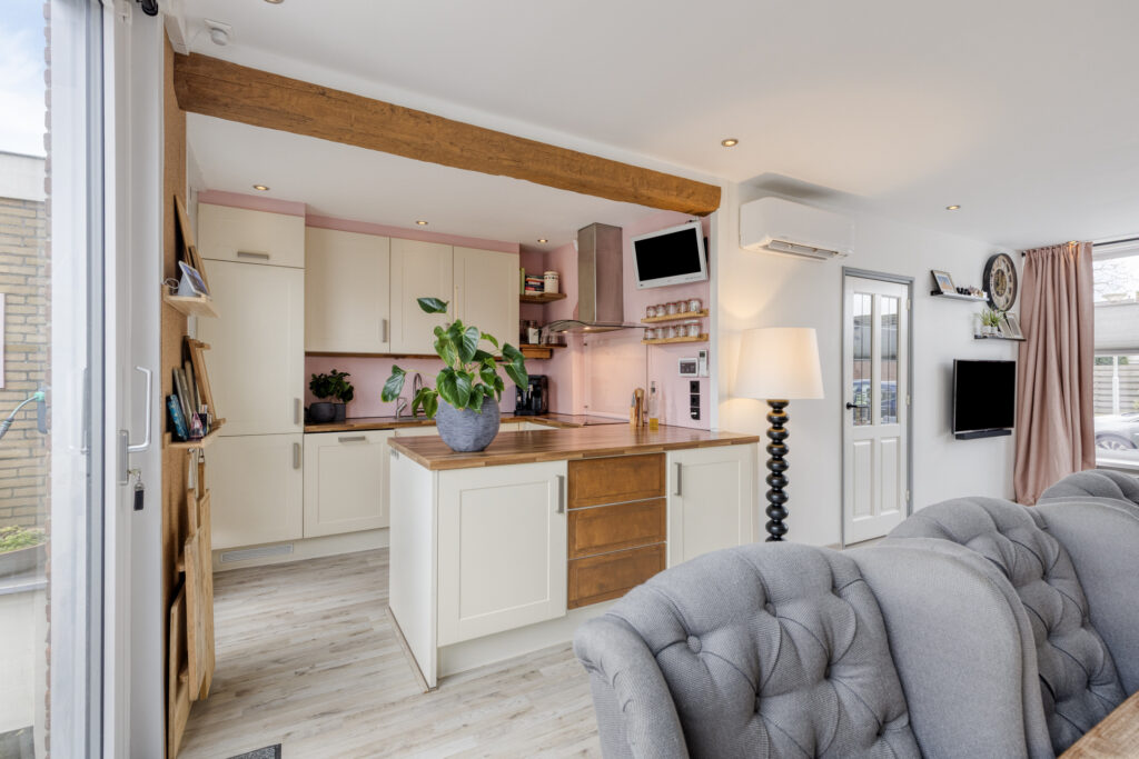 De open keuken in praktische U-opstelling sluit naadloos aan op de woonkamer en is voorzien van diverse inbouwapparatuur. Hierdoor kookt u hier met gemak terwijl u in contact blijft met uw gezin of gasten. In de trapkast zijn de wasmachine en droger netjes opgesteld, wat zorgt voor een efficiënte indeling van de ruimte.