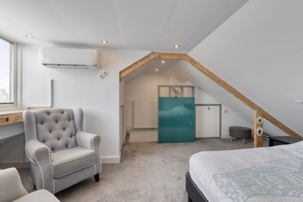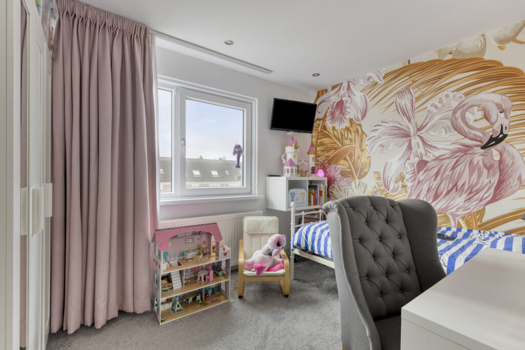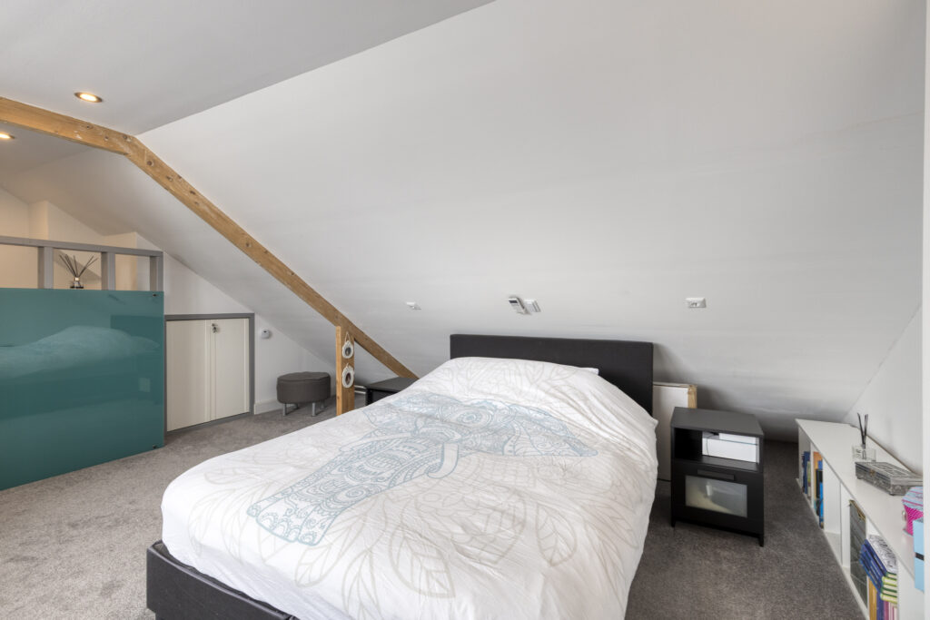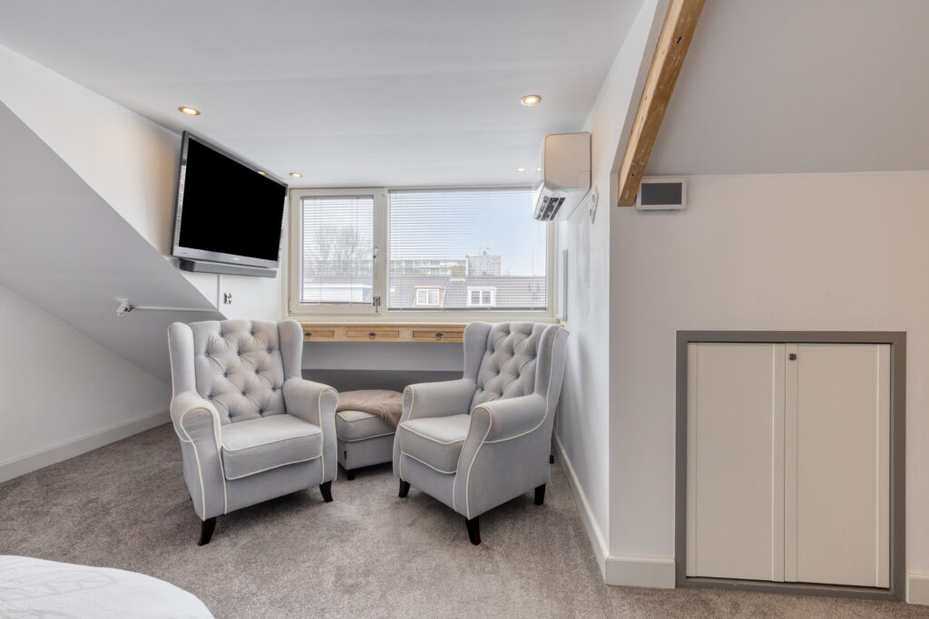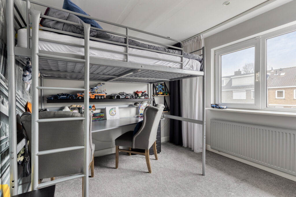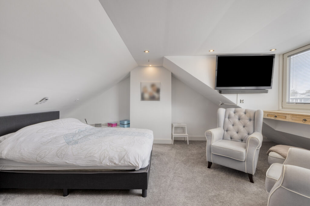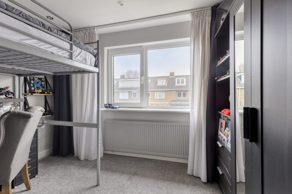 Op de eerste verdieping bevinden zich drie goede slaapkamers. Daarnaast is er een separate toiletruimte en een badcel met zitbad, douche en wastafel – functioneel en comfortabel ingericht. Via een vaste open trap bereikt u de tweede verdieping. Hier treft u een ruime open zolderverdieping met dakkapel, momenteel in gebruik als slaapkamer. Deze verdieping biedt naast de opstelplaats van de cv-ketel ook volop bergruimte en mogelijkheden voor bijvoorbeeld een werk- of hobbykamer.