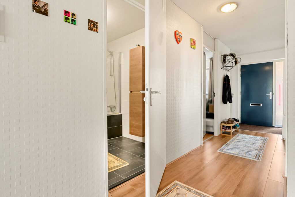 Via de afgesloten entree met trap én rolstoellift bereikt u de eerste verdieping van dit goed onderhouden appartementencomplex. De woning zelf verwelkomt u met een ruime gang die toegang biedt tot alle vertrekken. Aan de voorzijde vindt u twee fijne slaapkamers, waarvan de ouderslaapkamer is voorzien van een vaste kastenwand, terwijl de ruime en lichte woonkamer aan de achterzijde uitkijkt op het balkon.