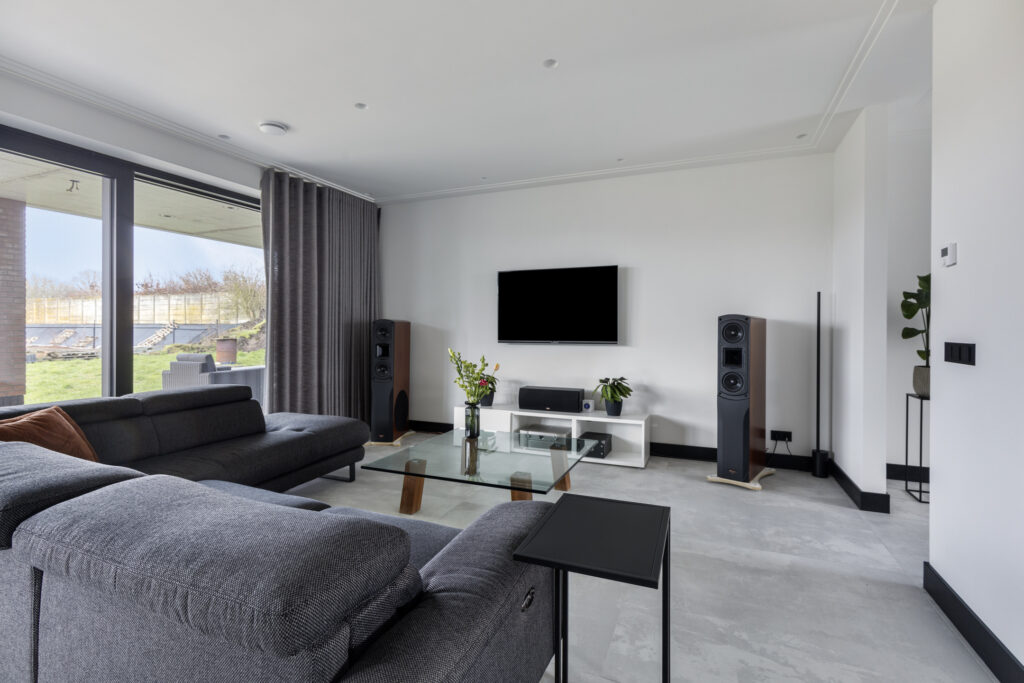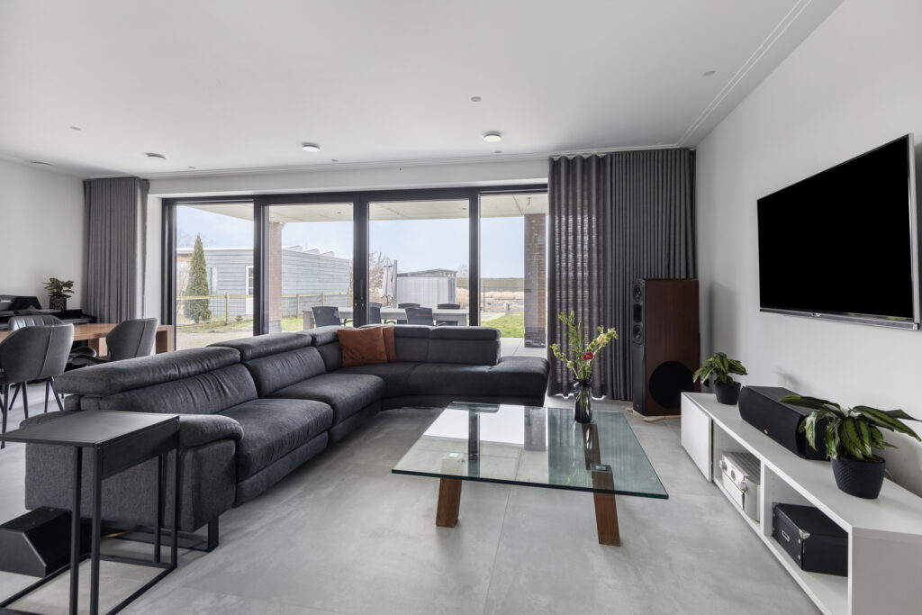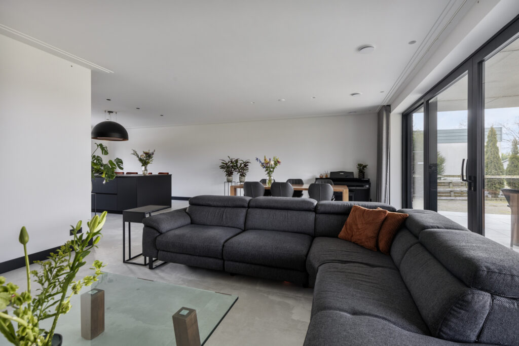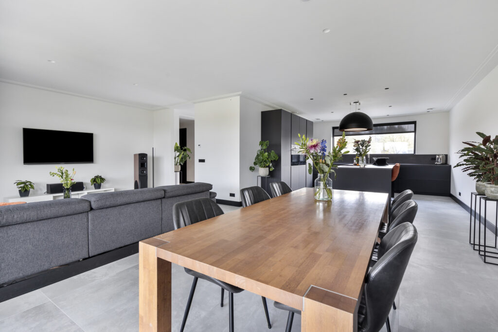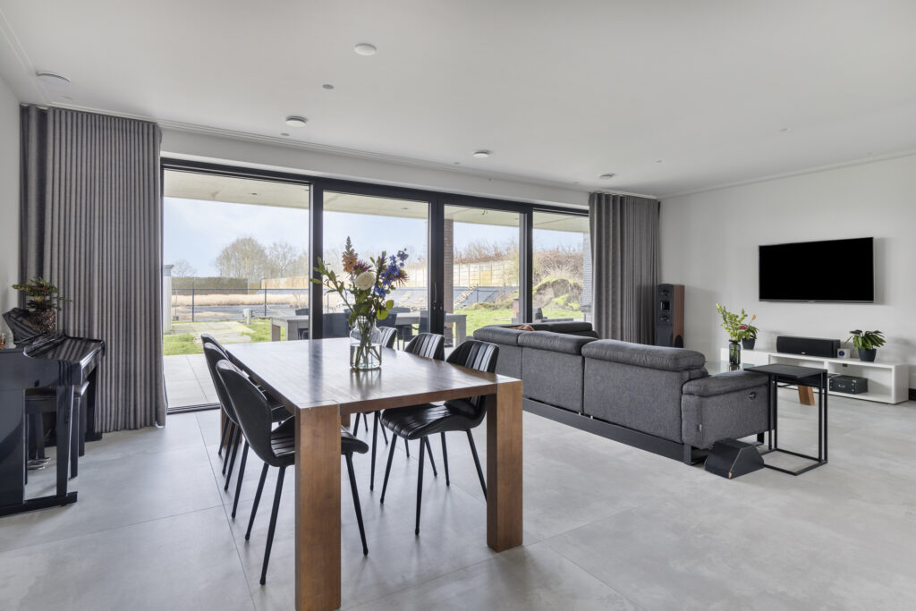 Over een breedte van maar liefst 7,7 meter biedt de stijlvolle woonkamer ruimte aan een royaal zit- en eetgedeelte.
