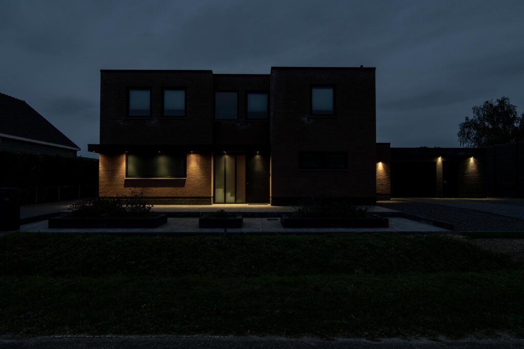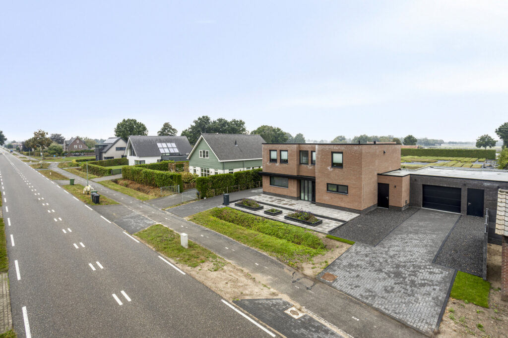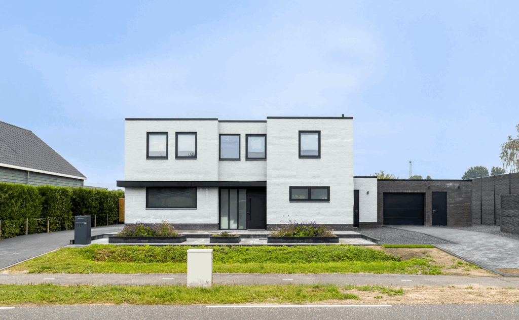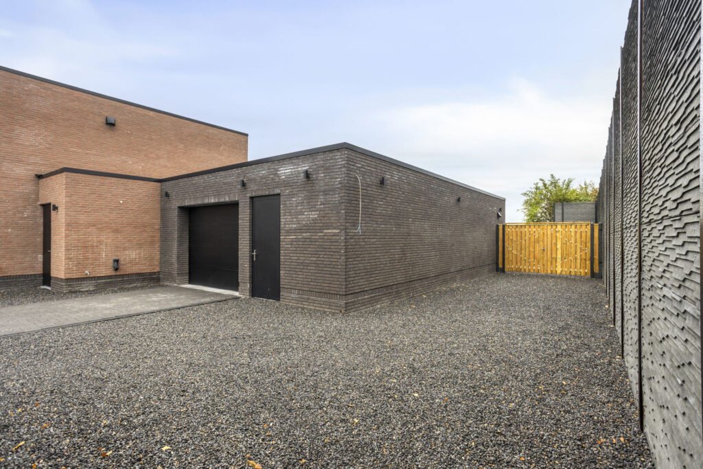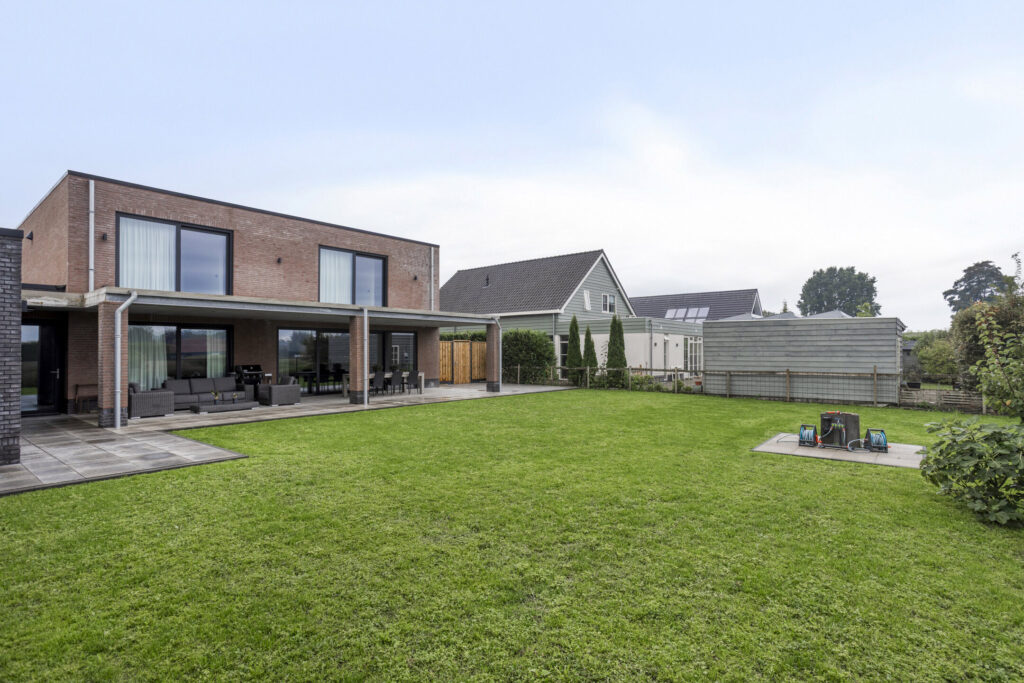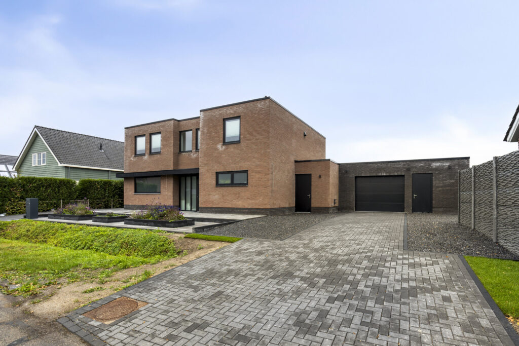 De voortuin en het terrein voor de woning zijn strak en onderhoudsvriendelijk aangelegd. Het brede perceel is aan beide zijden voorzien van een royale oprit met plaats voor meerdere auto’s. De oprit aan de rechterzijde geeft tot de inpandige garage. De moderne bestrating sluit naadloos aan op de strakke architectuur van de woning. Voor de woning zorgen verhoogde plantenbakken met beplanting voor een frisse uitstraling en een groene touch. Samen met de strakke lijnen en het ruime karakter geeft dit geheel de woning een representatieve en eigentijdse uitstraling.