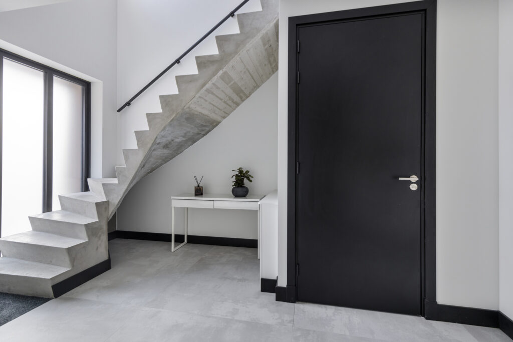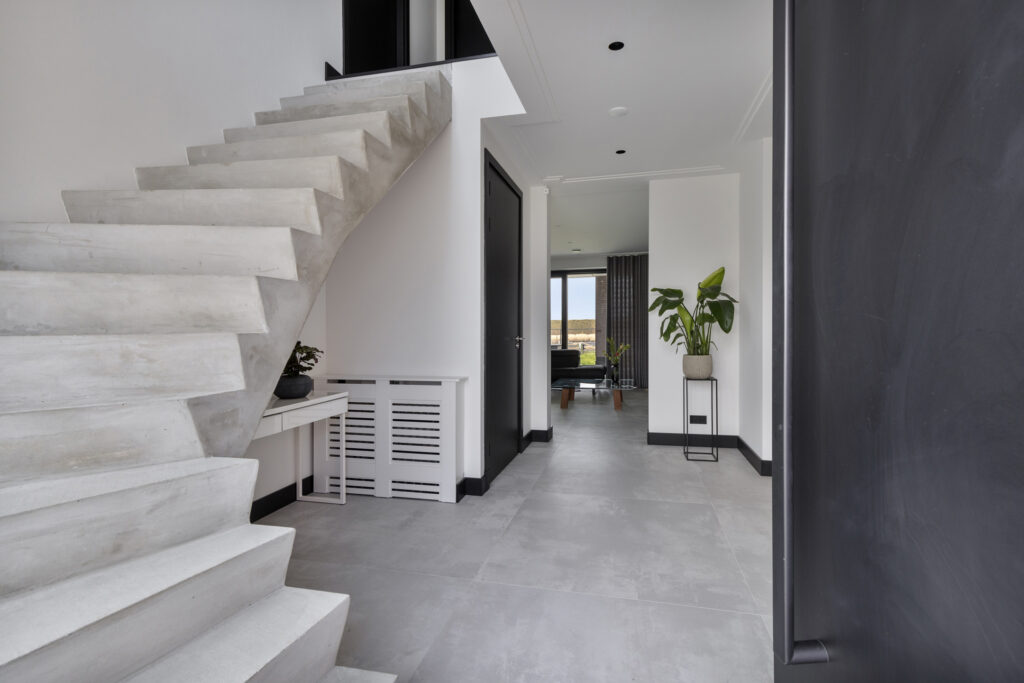 Via de trap in de hal is de eerste verdieping bereikbaar. De moderne Z-trap is uitgevoerd in beton. Een ware blikvanger!