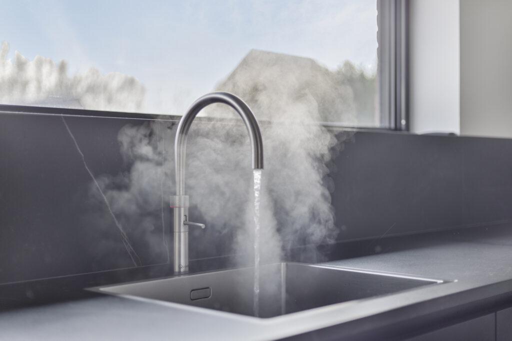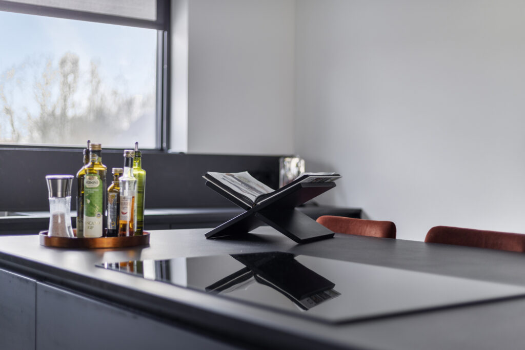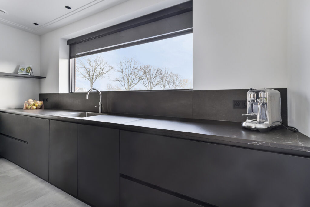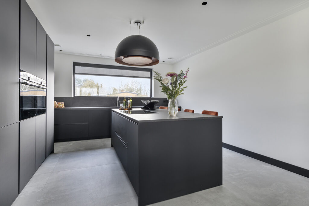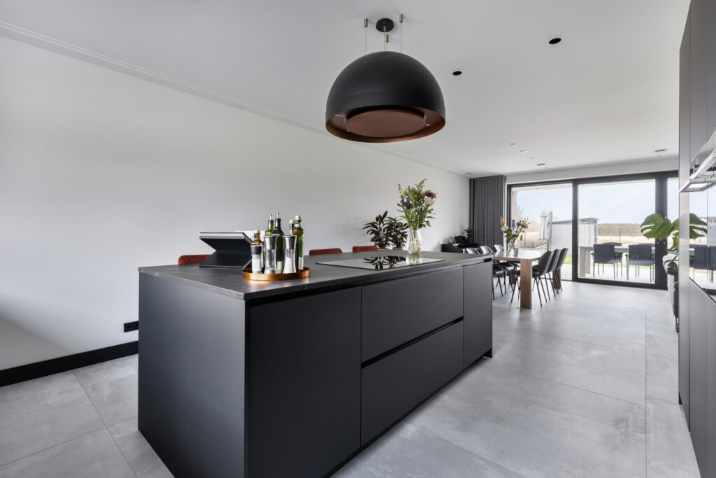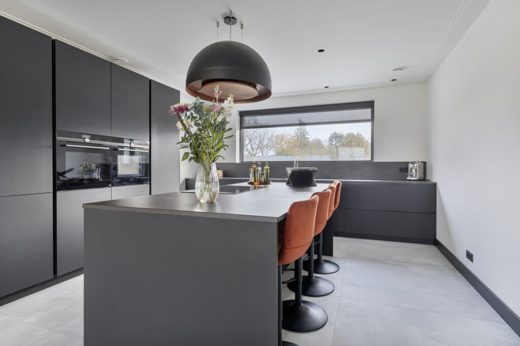 De keukeninrichting is uitgevoerd in zwarte kasten met een keramisch blad. In de apparatuurwand zijn de combi-stoomoven, combi-oven, koelkast en de koel/vriescombinatie verwerkt. Het aanrechtgedeelte voorziet in een spoelbak met Quooker kokendwaterkraan en vaatwasser.
