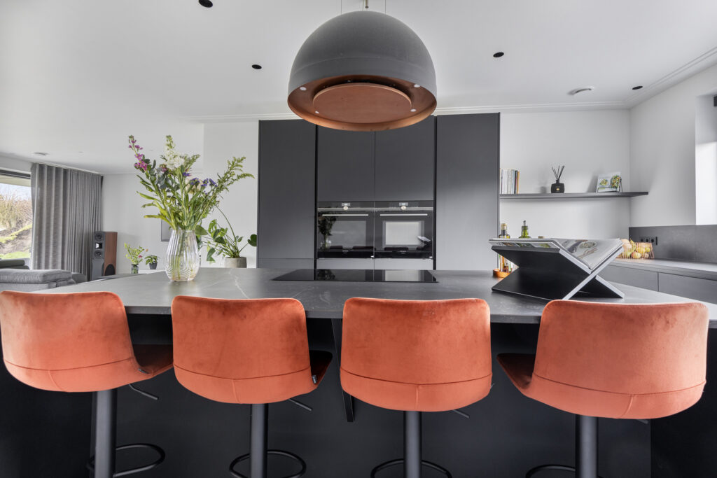Het kookeiland is de centrale plek in de keuken, met inductiekookplaat en design afzuigkap. De vier zitplekken bieden zitgelegenheid voor een snel ontbijt of een heerlijke borrel tijdens het koken. Door de open inrichting is er volop contact met de gasten aan tafel.