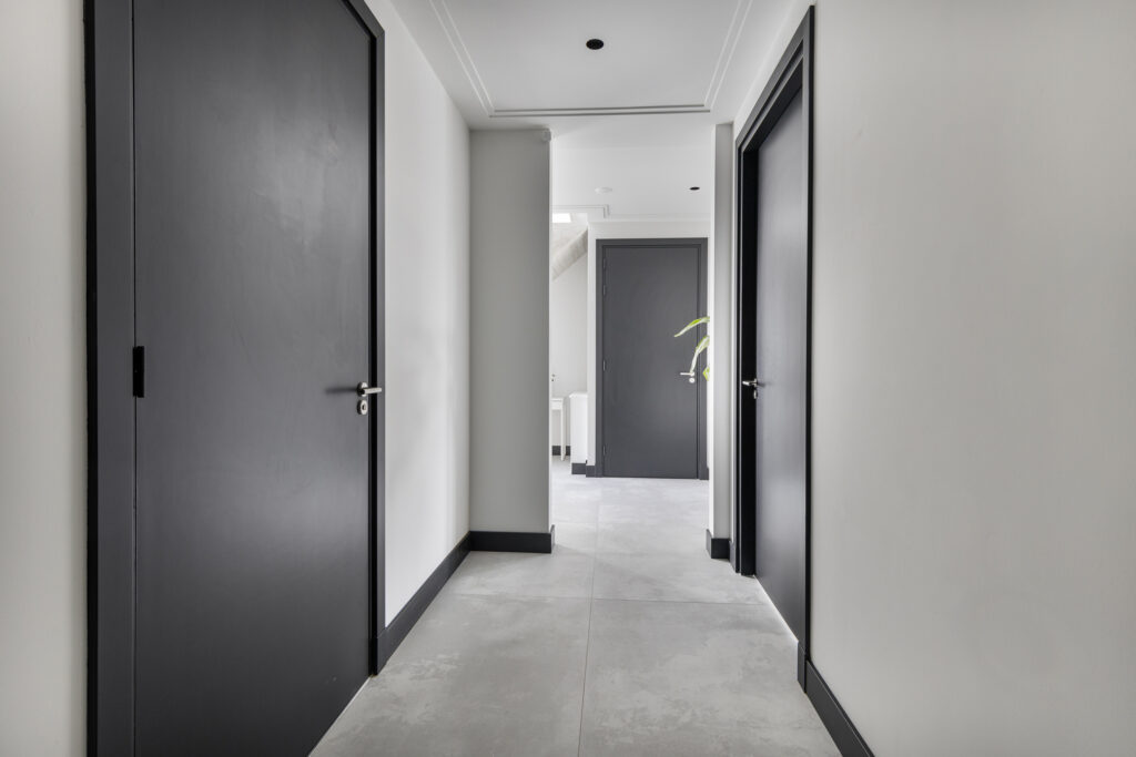 Bij binnenkomst in de hal voel je direct het moderne, strakke maar sfeervolle karakter van de woning. De ruimte die de hal te bieden heeft, is ook kenmerkend voor de rest van de woning.