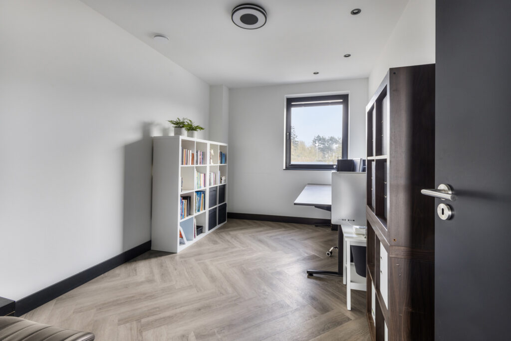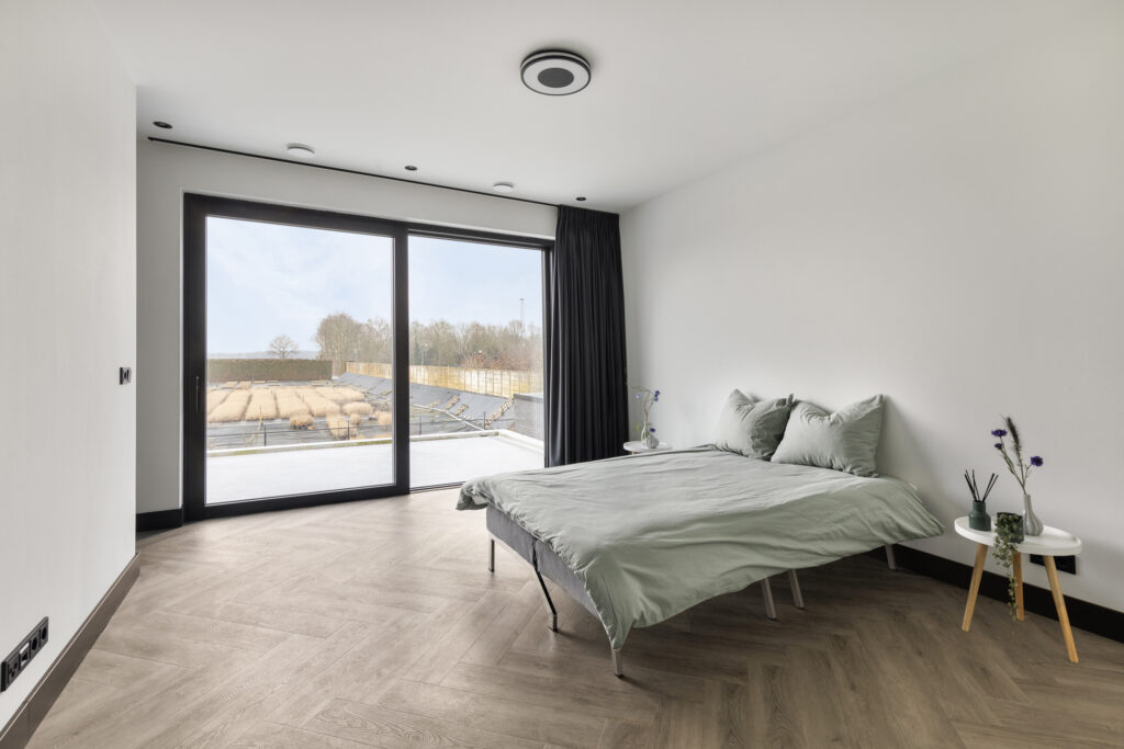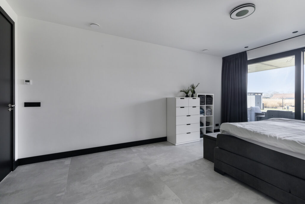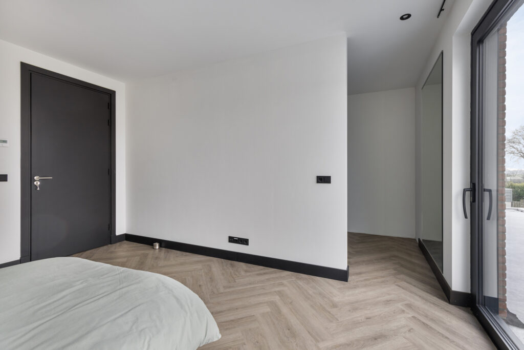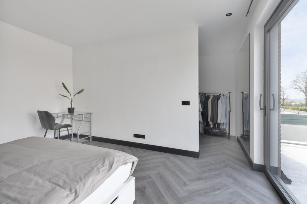 De slaapkamers en overloop zijn voorzien van de moderne visgraat PVC vloer. Alle wanden en het plafond zijn strak gestuukt. De plafonds zijn ook hier voorzien van inbouwspots.