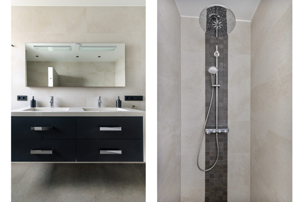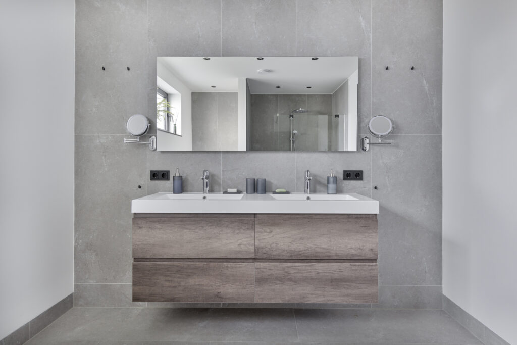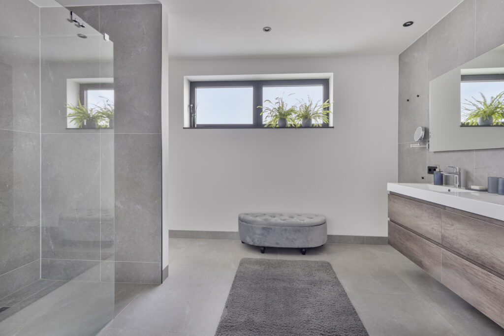 De luxe en zeer royale badkamer beschikt over een grote inloopdouche, hangcloset en wandmeubel met dubbele wastafel. De betegeling is uitgevoerd in grijstinten. Het houtlook wandmeubel biedt een zeer warm contrast, waardoor de ruimte heel sfeervol aanvoelt. Het raam zorgt voor veel daglicht en de mogelijkheid tot natuurlijke ventilatie.