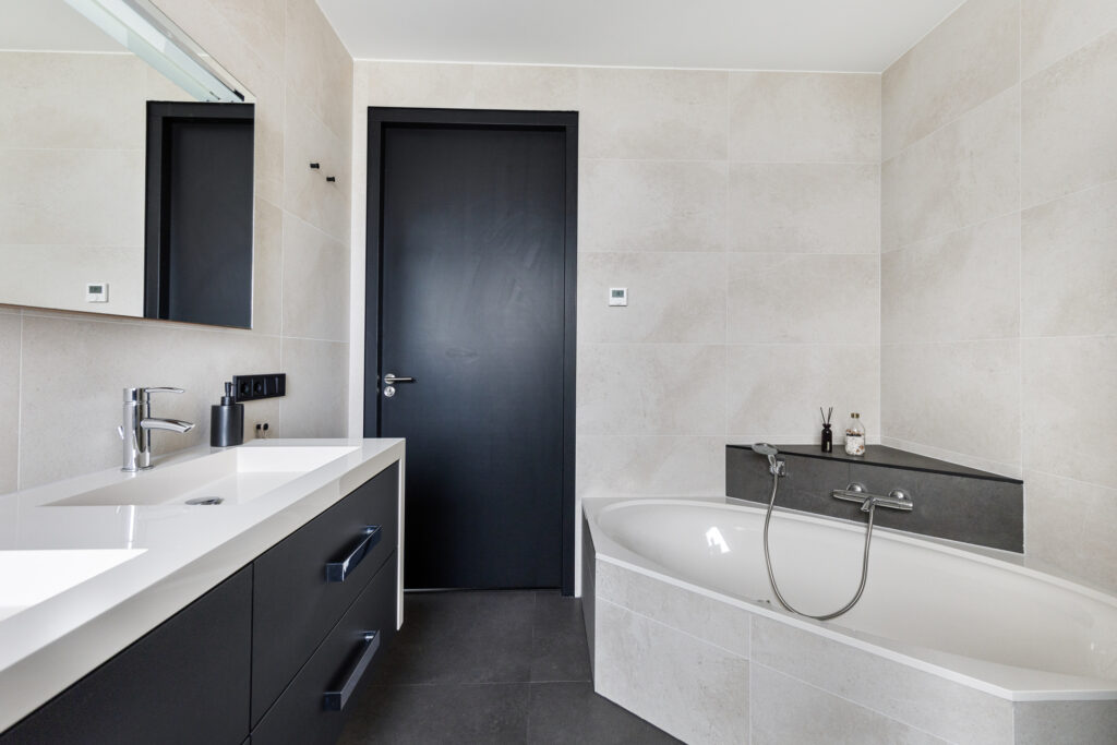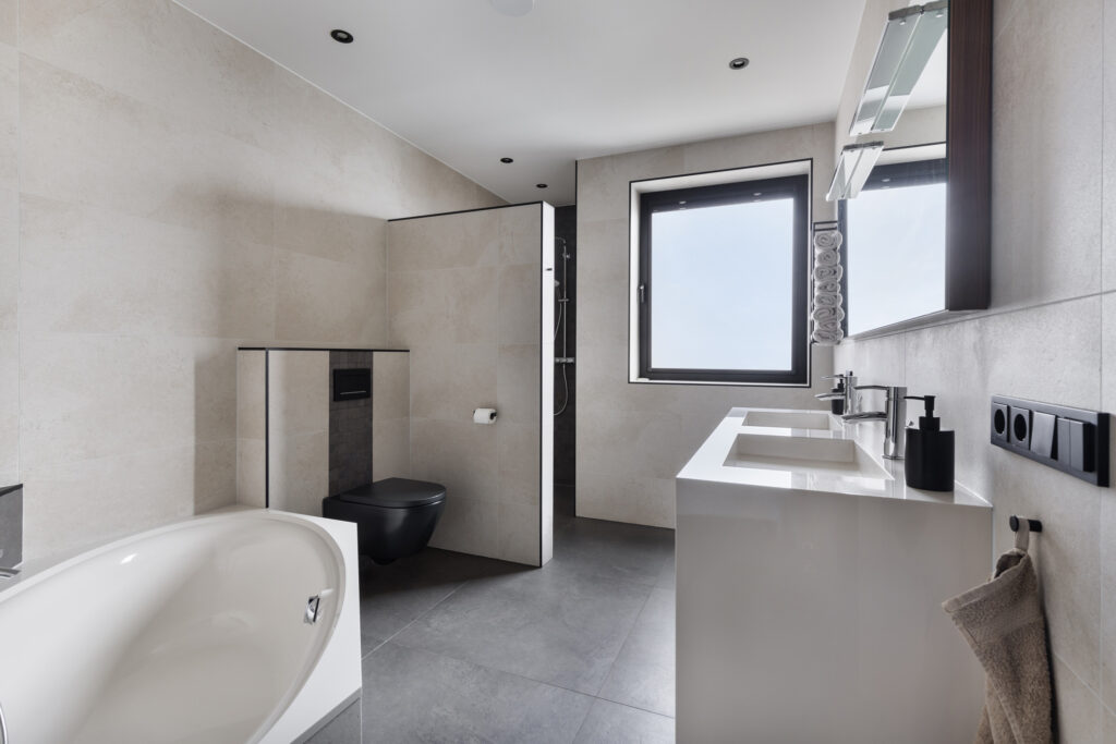 Ook op deze verdieping biedt de woning een zeer complete badkamer. Voorzien van (hoek)ligbad, wandmeubel met dubbele wastafel, inloopdouche en toilet. De wanden zijn volledig betegeld in een lichte kleur. Op de vloer ligt een donkergrijze tegel. Tegen de achterwand van het toilet, het bad en de douche is ook donkergrijze betegeling aangebracht. De badkamer beschikt over een raam wat voor veel daglicht en de mogelijkheid tot natuurlijke ventilatie zorgt.