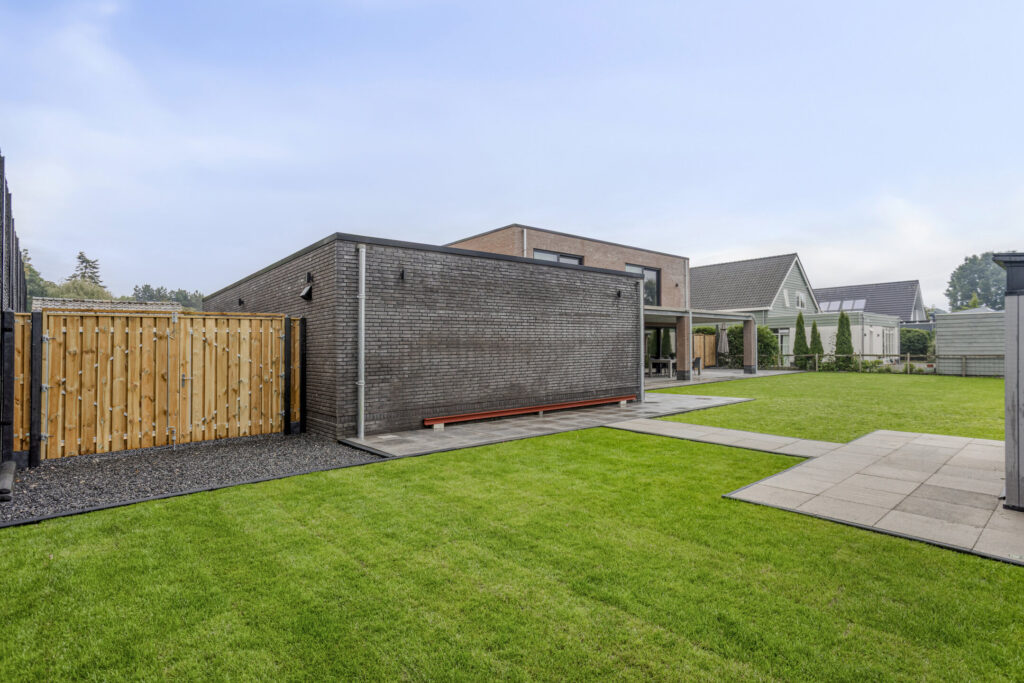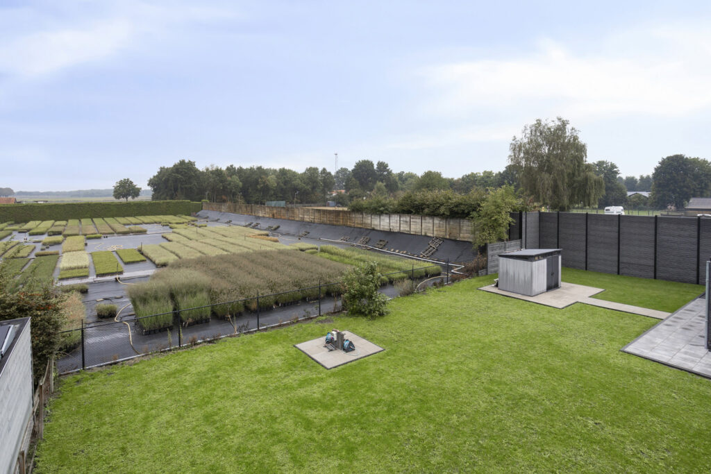 De achtertuin is volledig omheind en biedt daardoor veel privacy en veiligheid. Aan de rechterzijde zorgen de hogere, moderne schuttingdelen in donkere tinten voor een strakke uitstraling. Aan de linkerzijde en achterzijde is gekozen voor een gaashekwerk, waardoor je vanuit de tuin een vrij en landelijk uitzicht behoudt over de aangrenzende percelen. Deze combinatie maakt dat de tuin zowel beschut als open aanvoelt, met volop ruimte en een vrij gevoel.