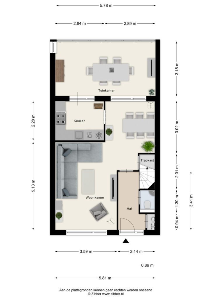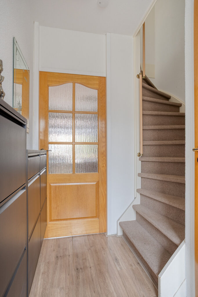 In deze hal bevinden zich de meterkast, de toiletruimte en de beklede trapopgang naar de verdieping.