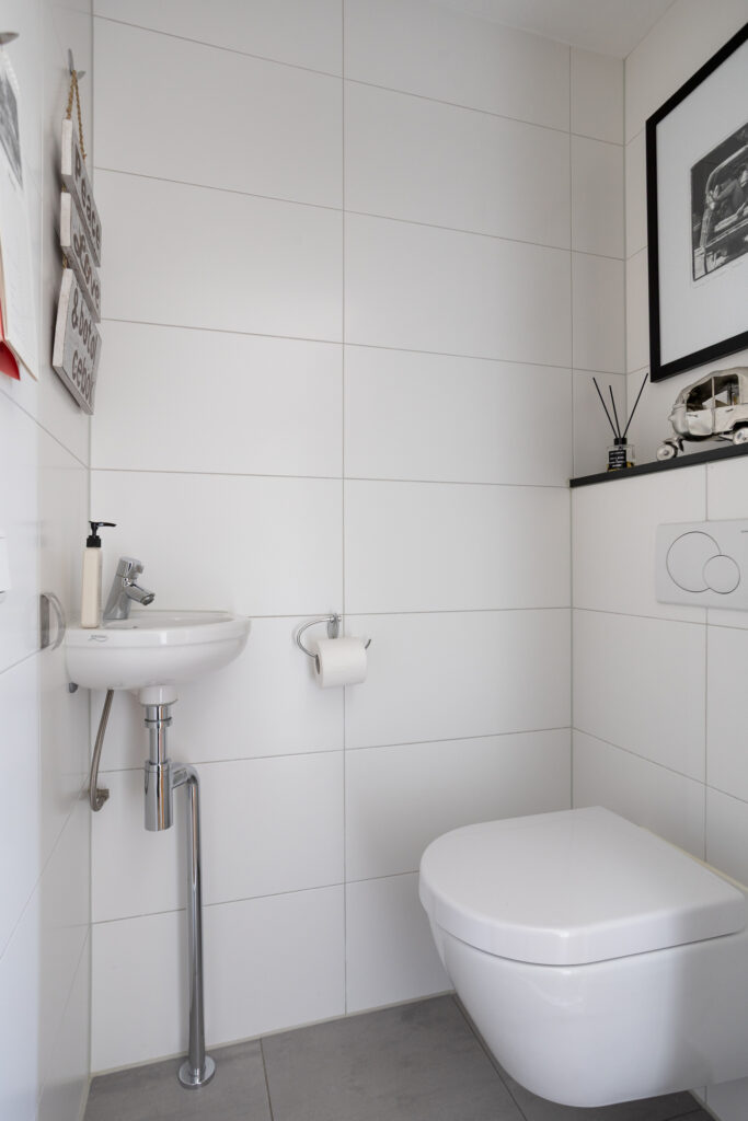 De gerenoveerde en volledig betegelde toiletruimte, met een verlaagd plafond met een LED inbouwspot, is voorzien van een wandcloset en hoekfonteintje, alsmede een elektrische afzuiging.