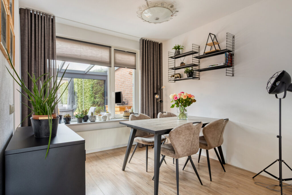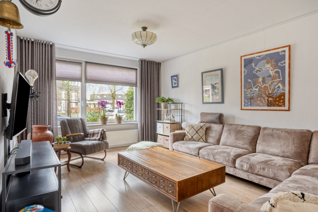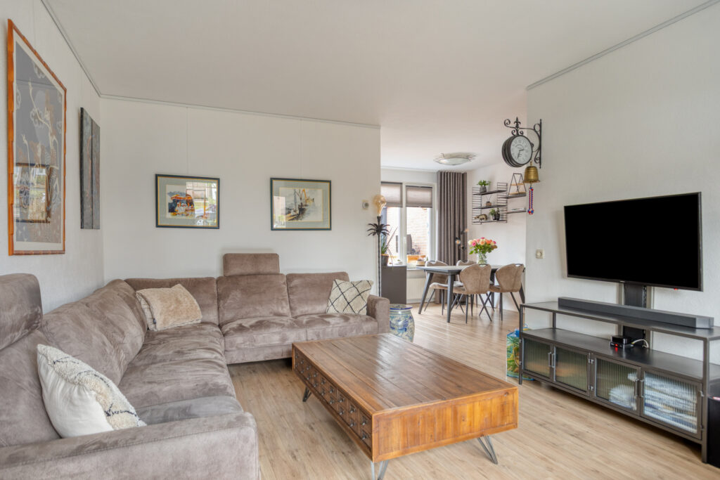 Vanuit de hal heeft u toegang tot de gezellige, Z-vormige woon-/eetkamer (van ± 29 m²), met kunststof kozijnen met draai-/kiepramen, welke naast de voormelde laminaatvloer eveneens is voorzien van met spachtelputz afgewerkte wanden.