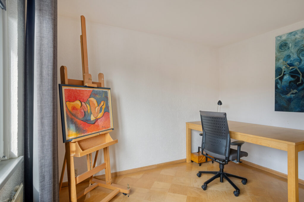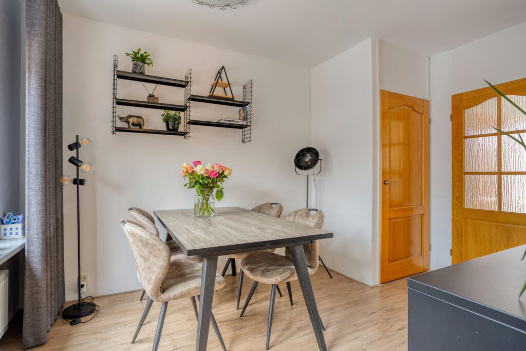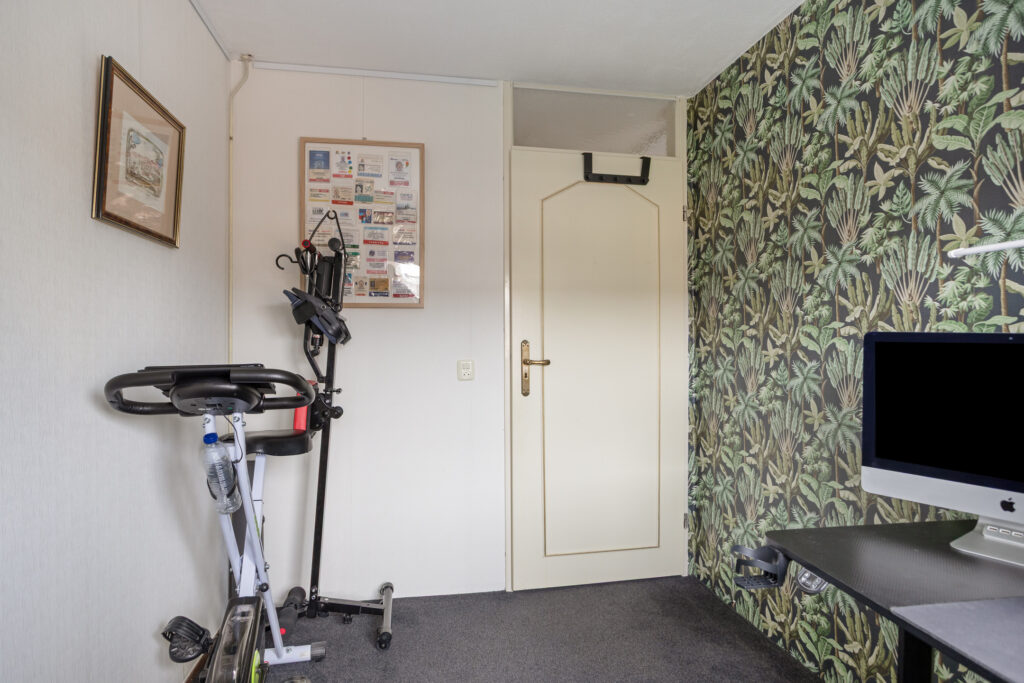 In dit woongedeelte bevinden zich de glasvezelaansluiting en een schilderij ophangsysteem, alsmede een praktische trapkast met de voormelde laminaatvloer, legplanken en een lichtpunt.