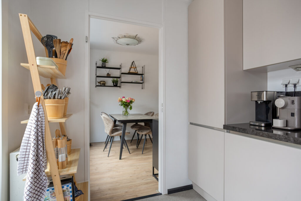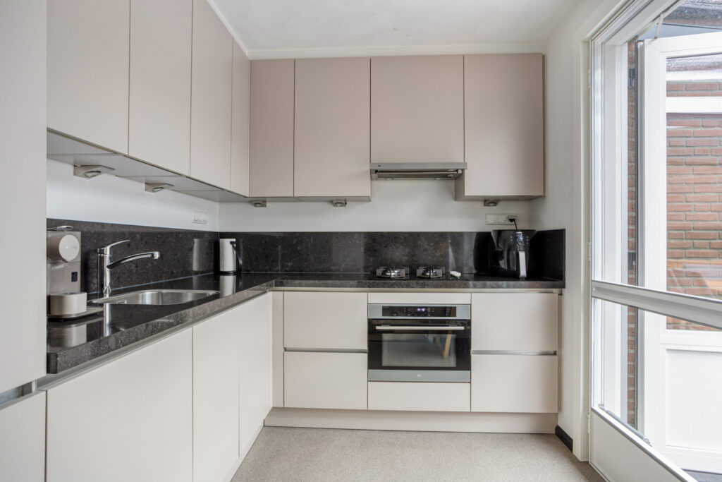 Deze keuken is in 2018 gerenoveerd en voorzien van een moderne, hoekopgestelde keukeninstallatie met diverse onder- en bovenkasten en laden (incl. een ‘Le Mans’ hoekkastsysteem), halogeen spots onder de bovenkasten en diverse stopcontacten, een composiet aanrechtblad met achterwand en een RVS spoelbak met een éénhendelmengkraan en een 4-pits glazen gaskookplaat, een vlakscherm-afzuigkap, een combi-oven/magnetron, vaatwasser (uit november 2023), koelkast en vriezer.