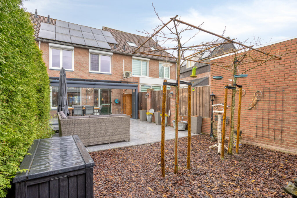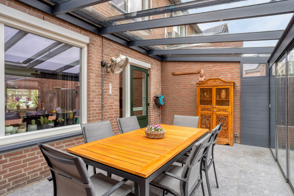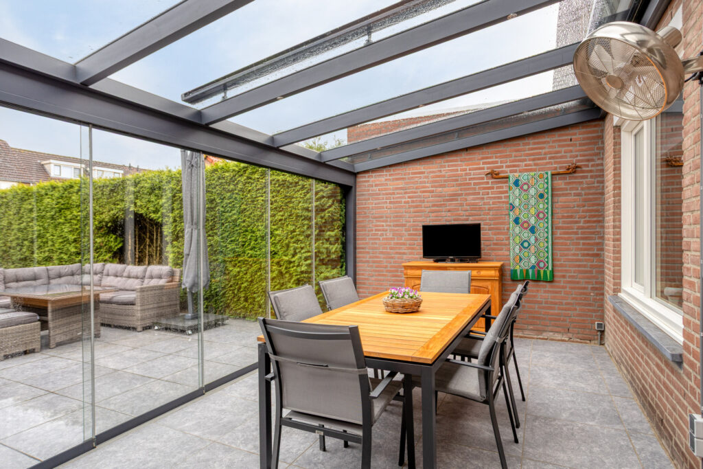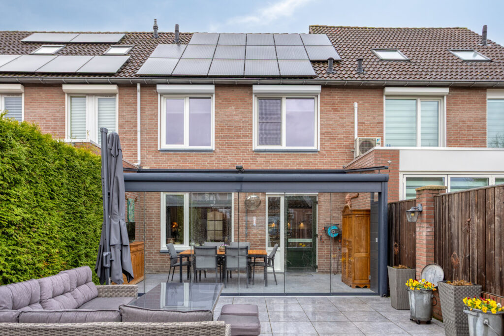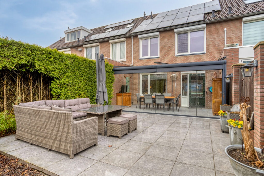 Tegen de achtergevel van de woning is in 2022 over de volle breedte een fraaie, aluminium tuinkamer geplaatst, welke is voorzien van glazen dakplaten met elektrische, op afstand bedienbare zonwering, eveneens op afstand bedienbare inbouwspots en 6 hardglazen schuifwanden.