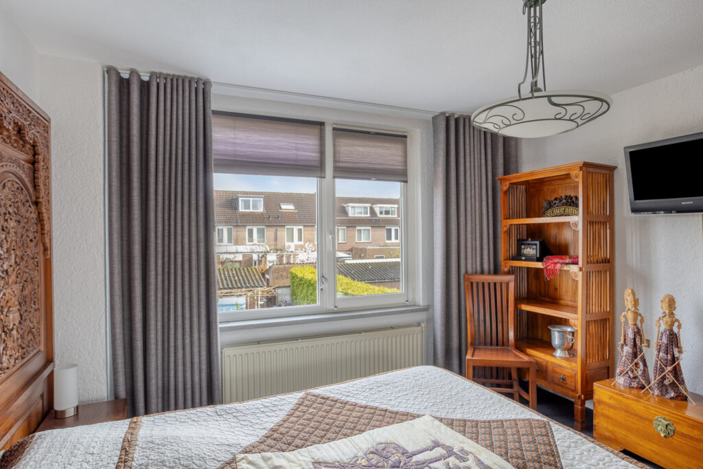 De 3 slaapkamers (van resp. ± 6, 12 en 15 m²) zijn eveneens allen voorzien van kunststof kozijnen met draai-/kiepramen en t.p.v. de kamers aan de achterzijde elektrische, op afstand bedienbare rolluiken. In het draai-/kiepraam van de hoofdslaapkamer bevindt zich daarnaast een inzethor.
