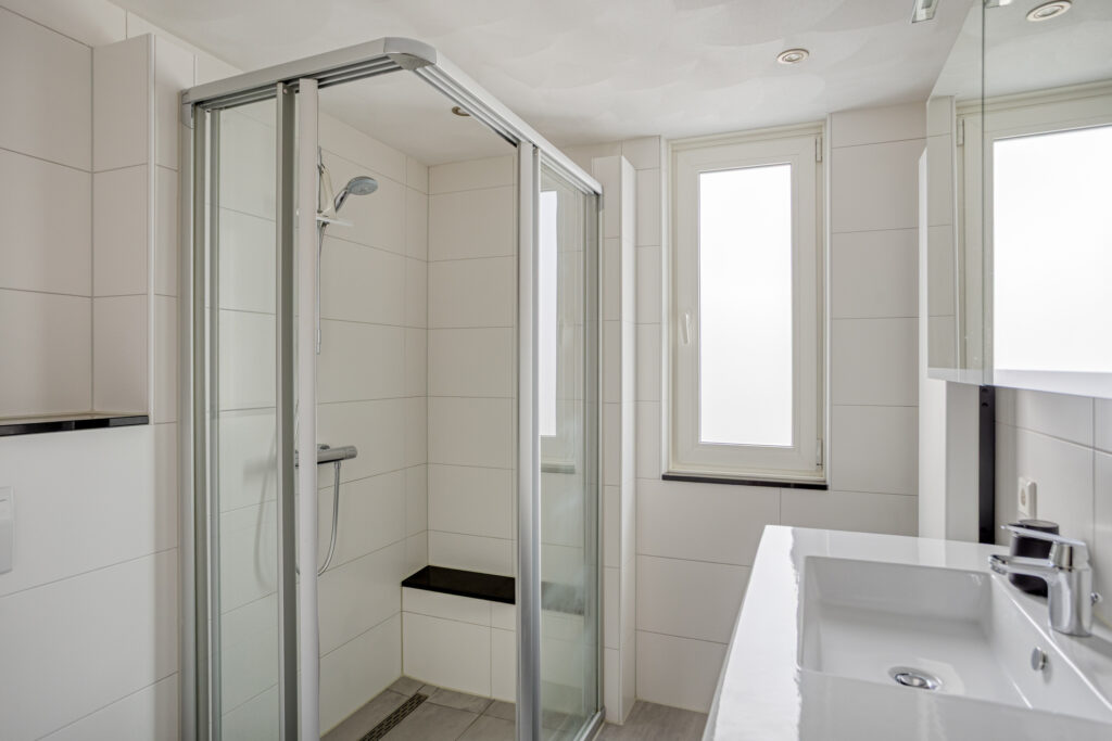 De gemoderniseerde en volledig betegelde badkamer, met een kunststof draai-/kiepraam in de voorgevel t.b.v. de daglichttoetreding en extra ventilatie en een verlaagd plafond met inbouwspots, is ingericht met een inloopdouche met aluminium douchewanden met schuifdeuren met hardglas, een klein plateau, een handdouche met thermostaatkraan en een RVS douchegootje, een 2e wandcloset en een wastafelmeubel met 2 laden en een éénhendelmengkraan, alsmede een dubbel bovenkastje met spiegeldeurtjes, verlichting en een stopcontact.