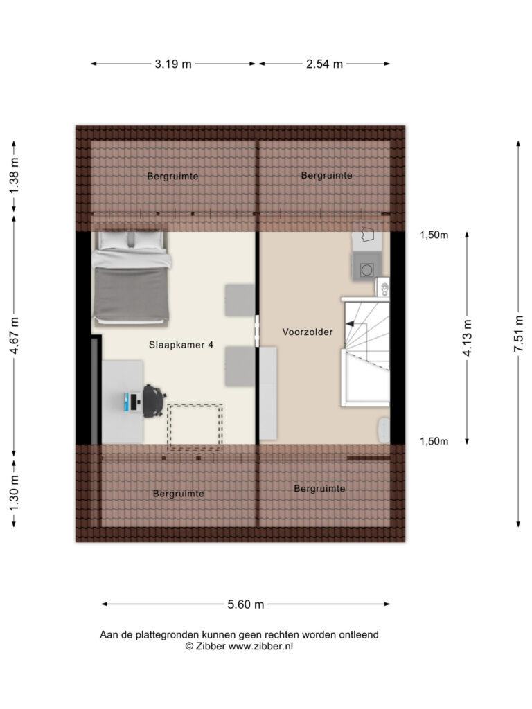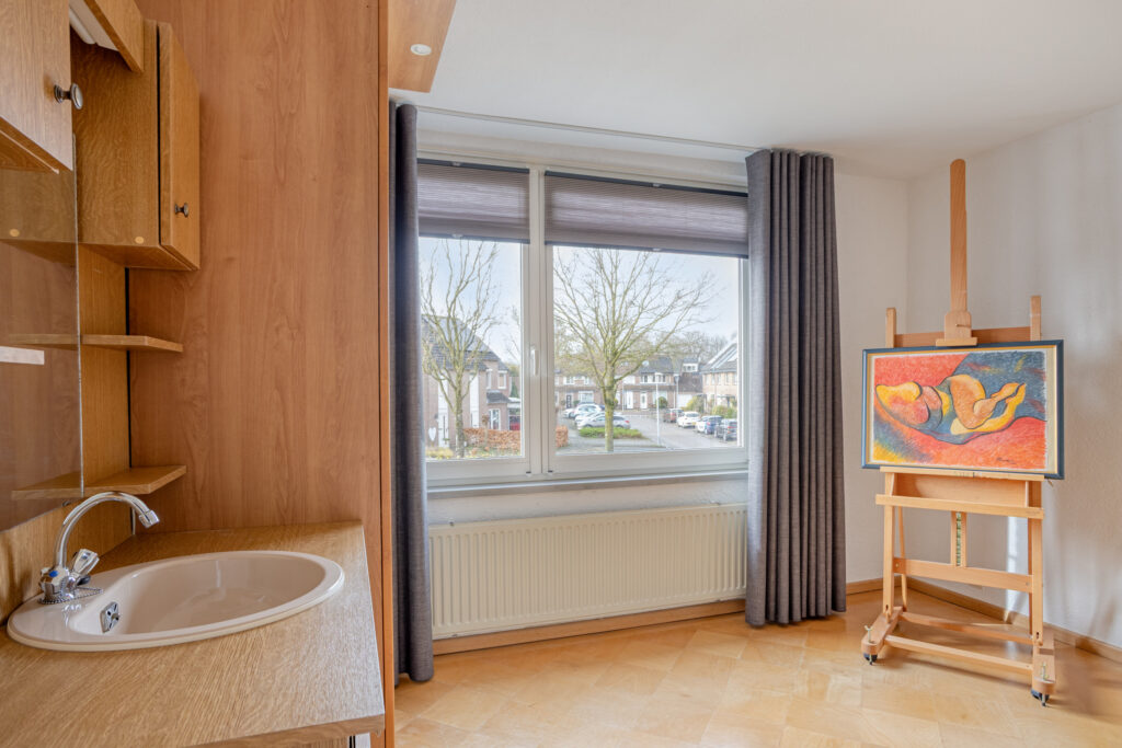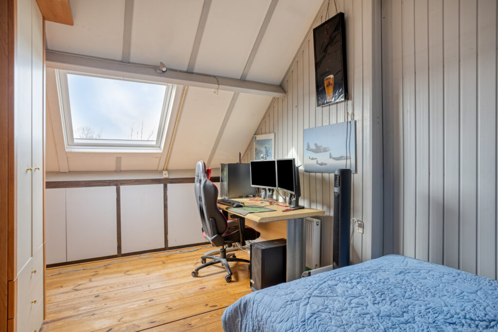 Vanaf de voorzolder betreedt u vervolgens de ruime zolderkamer annex 4e slaapkamer (van ± 15 m²), met de voornoemde grenen plankenvloer en de met kunststof schroten afgewerkte woningscheidende wand. Deze kamer is verwarmd en voorzien van een (in 2024 vernieuwd) ‘Velux’ dakraam met een verduisteringsgordijn/zonwering, alsmede van eveneens afgesloten bergruimtes onder de kaphelling aan de voor- en achterzijde en een enkele en een 2-deurs vaste kast.