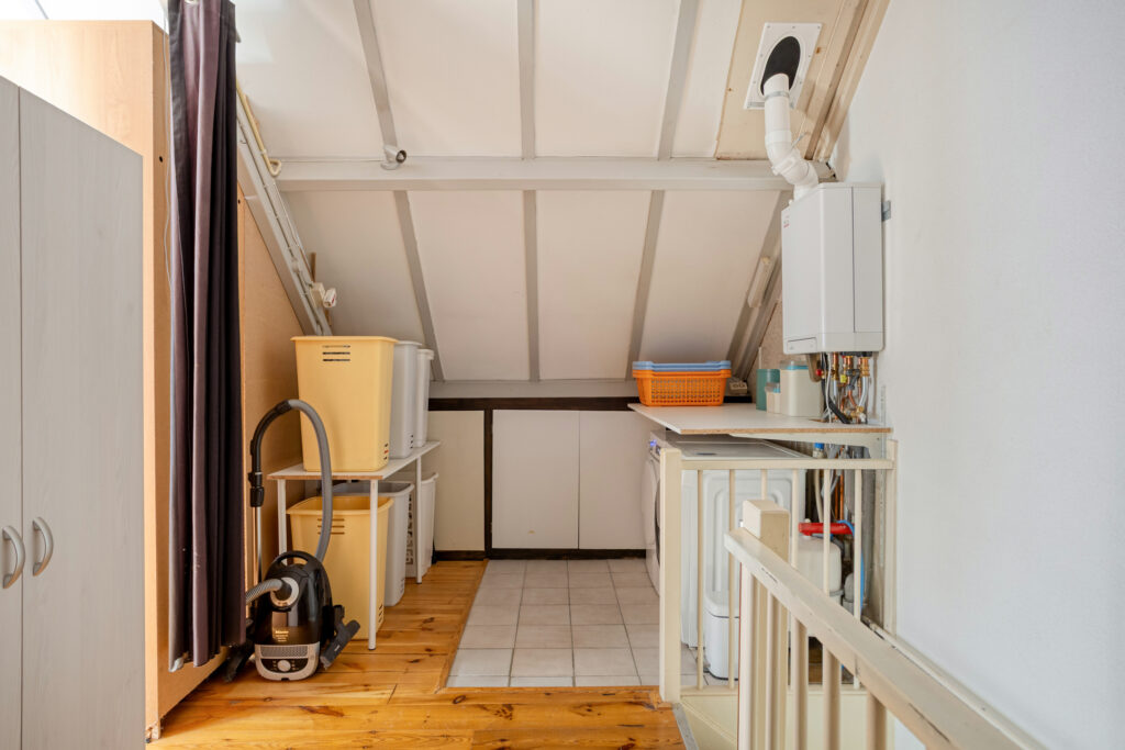 Via de vaste, beklede trap achter de deur op de 1e verdieping bereikt u de voorzolder op deze verdieping, welke grotendeels is afgewerkt met een grenen plankenvloer (welke is doorgelegd in de zolderkamer) en een deels betegelde vloer aan de achterzijde, met aldaar de aansluitingen t.b.v. de wasapparatuur en de opstelling van de in januari 2024 geïnstalleerde ‘Intergas Kompakt’ H.R.-combiketel (met bouwjaar: 2023).