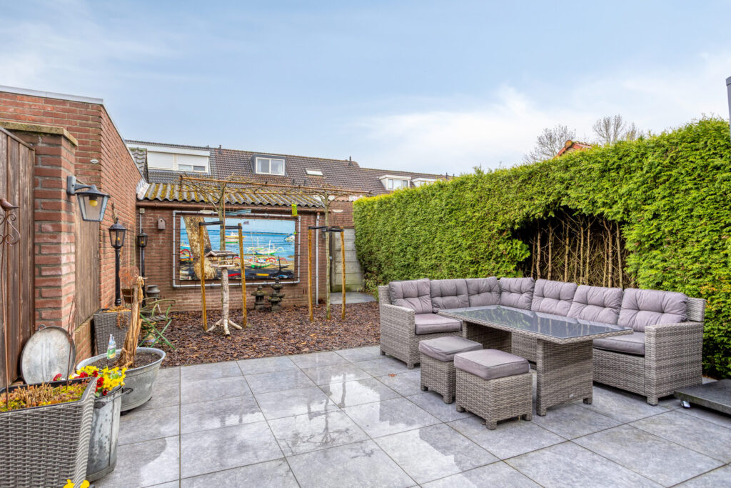 De eveneens keurig aangelegde, ca. 12 meter diepe en geheel omsloten achtertuin is gesitueerd op het zuidoosten en voorzien van een afsluitbare poort naar het achtergelegen buurpad.