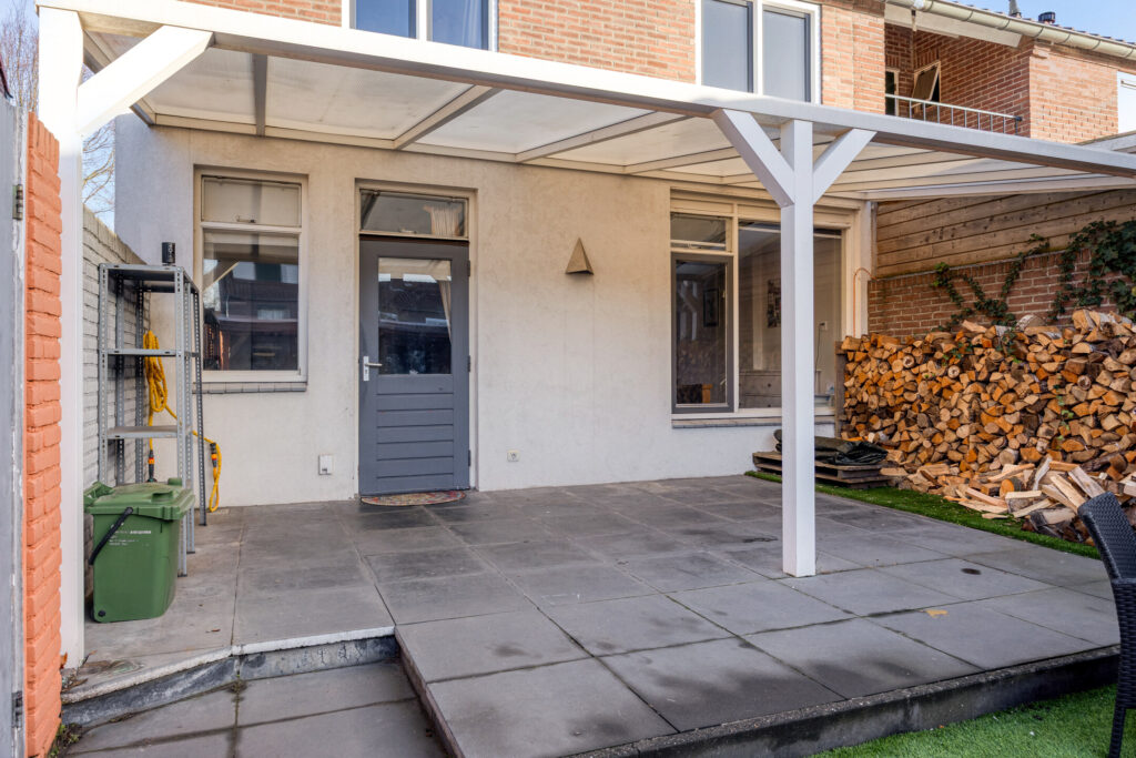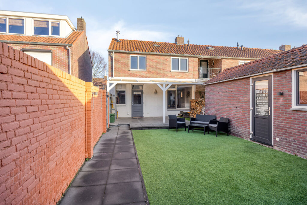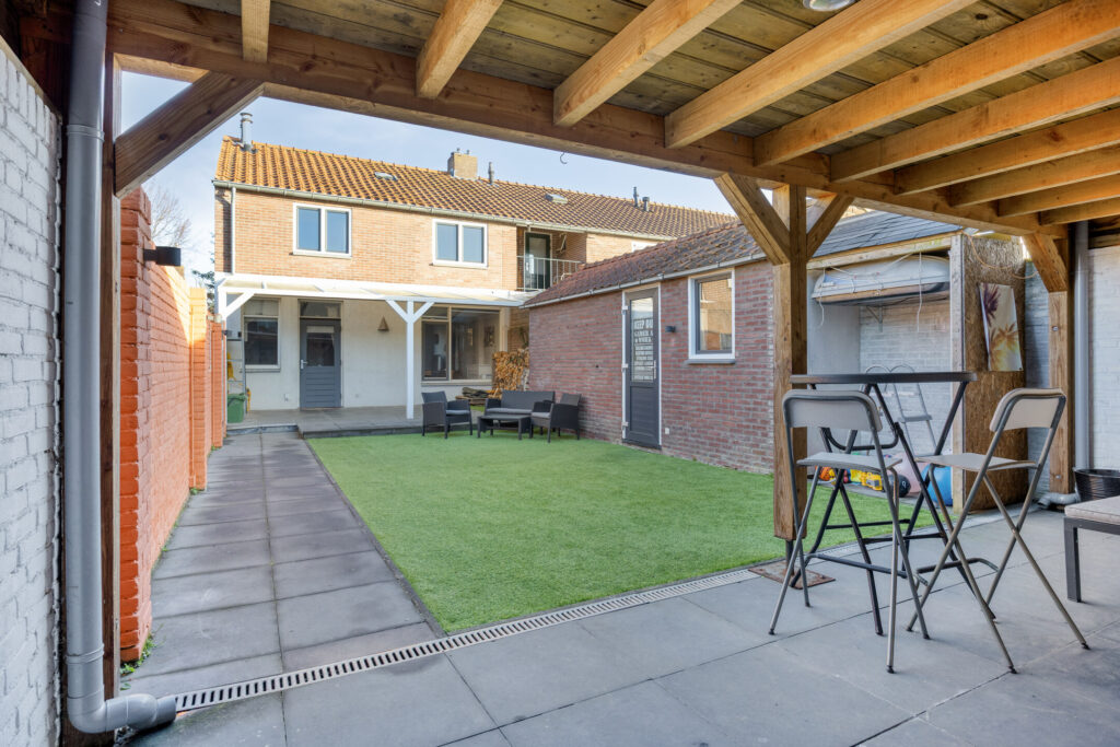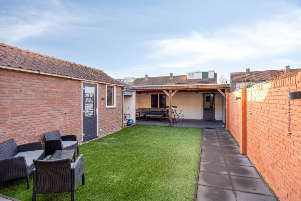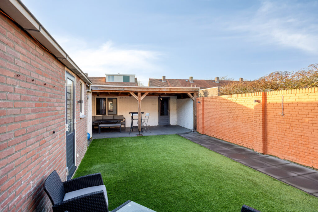 De woning beschikt over een hele diepe, geheel omsloten achtertuin op het westen, voorzien van een tweetal terrassen en kunstgras. Hier kunt u tot in de avonduren heerlijk van de zon genieten. De tuin is tevens bereikbaar via een achterom. Aan de tuin grenzen meerdere overkappingen, waaronder een aluminium overkapping en een in 2020 gerealiseerde Douglas houten overkapping.
