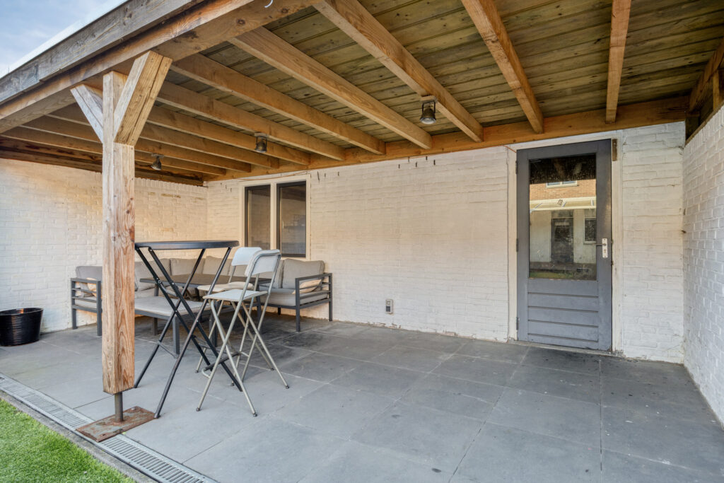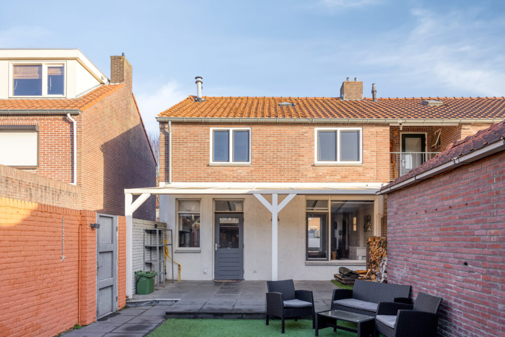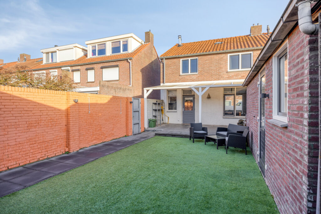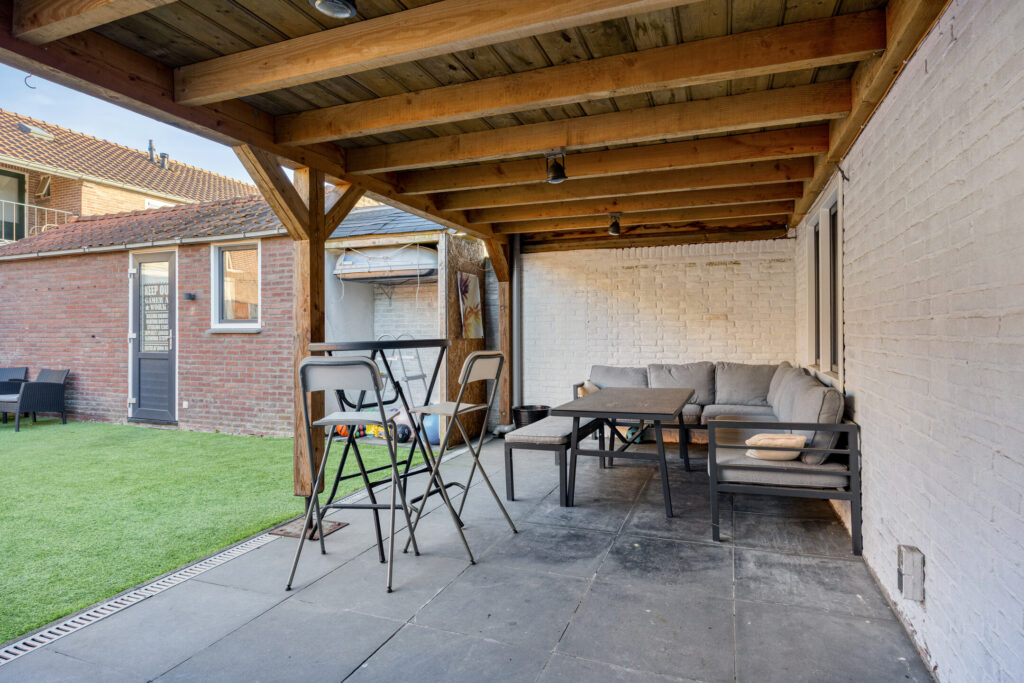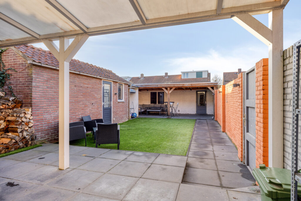 De woning beschikt over een hele diepe, geheel omsloten achtertuin op het westen, voorzien van een tweetal terrassen en kunstgras. Hier kunt u tot in de avonduren heerlijk van de zon genieten. De tuin is tevens bereikbaar via een achterom. Aan de tuin grenzen meerdere overkappingen, waaronder een aluminium overkapping en een in 2020 gerealiseerde Douglas houten overkapping.