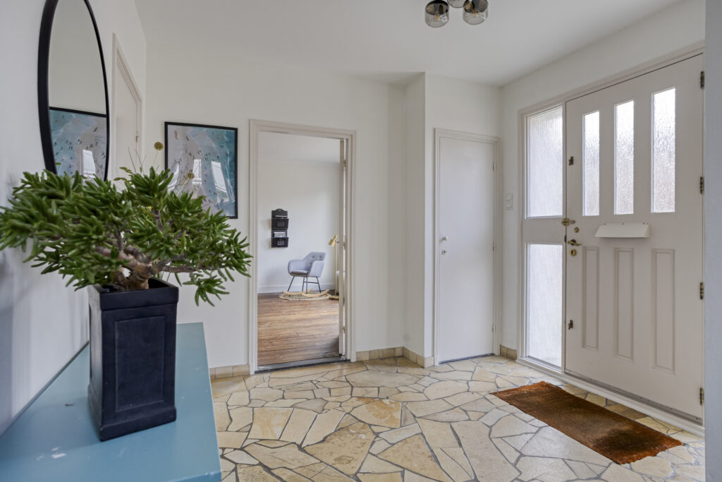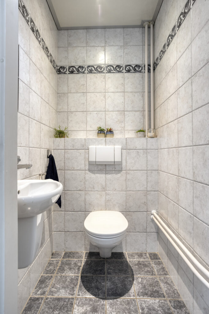 Via de ruime oprit bereikt u de entree van de woning. De ontvangsthal is voorzien van een garderobe, meterkast met uitgebreide groepenkast, trapopgang naar de verdieping en een volledig betegelde toiletruimte met wandcloset en fonteintje. Vanuit de hal is er toegang tot de living en de keuken.