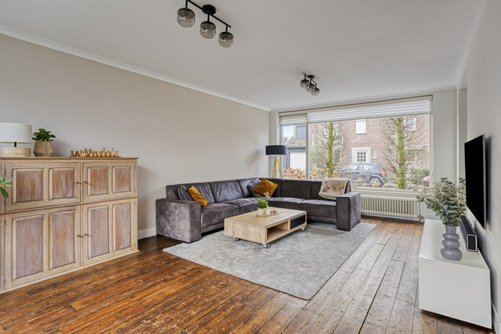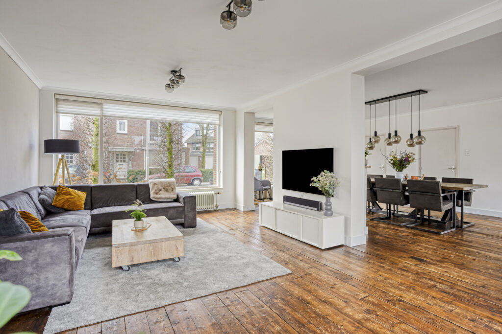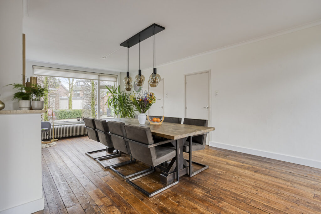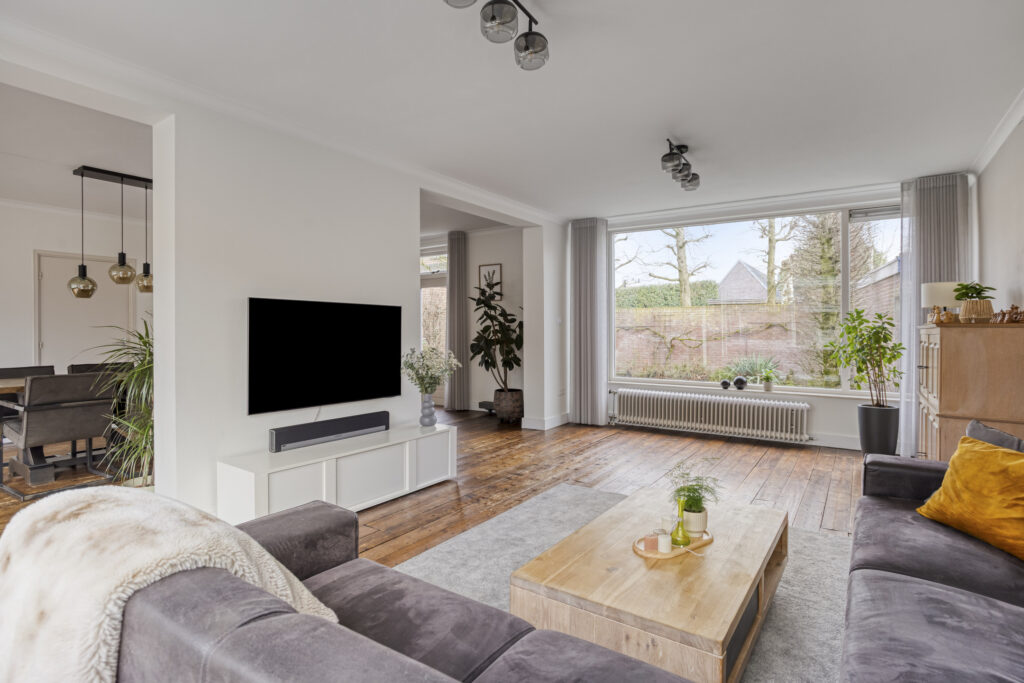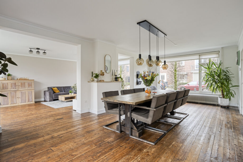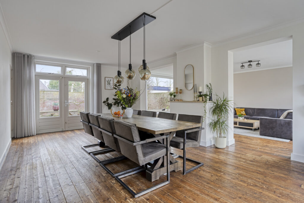 De sfeervolle en lichte living is opgedeeld in een aangebouwde zitkamer aan de ene zijde en een eetkamer aan de andere zijde. Beide ruimtes beschikken over een houten planken vloer, strak stucwerk op de wanden en plafonds met sierlijsten. Vanuit de eetkamer geven openslaande deuren toegang tot het terras. Daarnaast beschikt deze ruimte over een schouw met rookkanaal (thans niet in gebruik), een praktische inbouwkast en een deur naar de keuken.