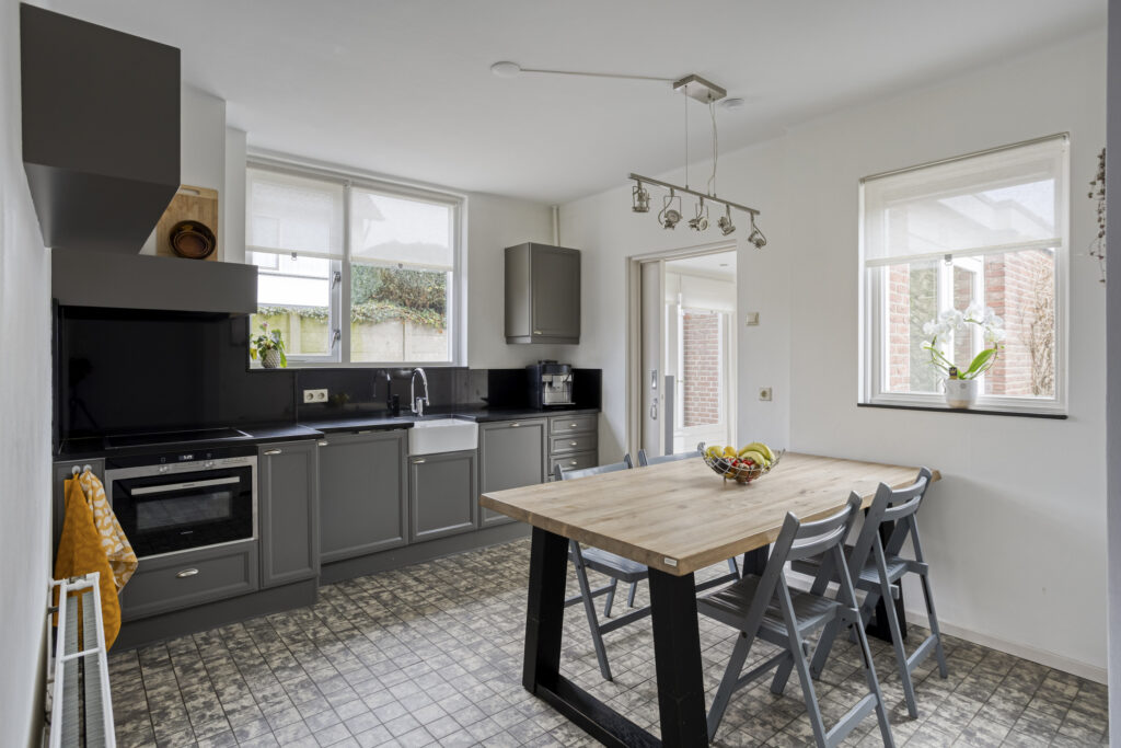 De leefkeuken is voorzien van een tegelvloer en een keukeninrichting in wandopstelling met een granieten aanrechtblad en geïntegreerde spoelbak. De keuken is uitgerust met de volgende inbouwapparatuur: