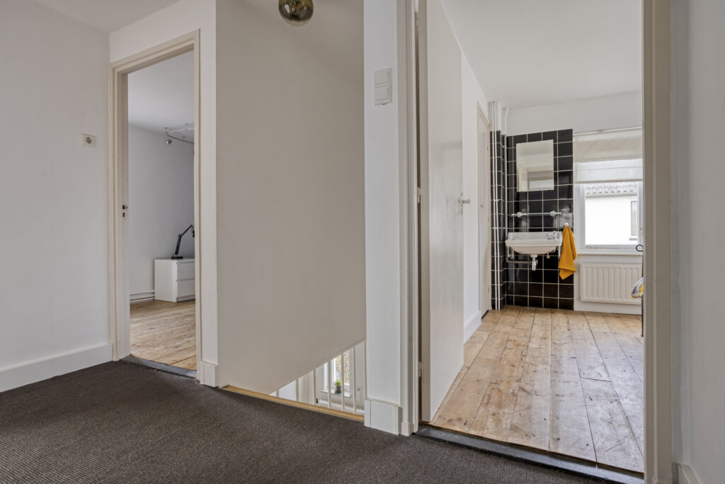 Overloop met toegang tot vier slaapkamers, de badkamer en een vlizotrap naar de zolderverdieping.