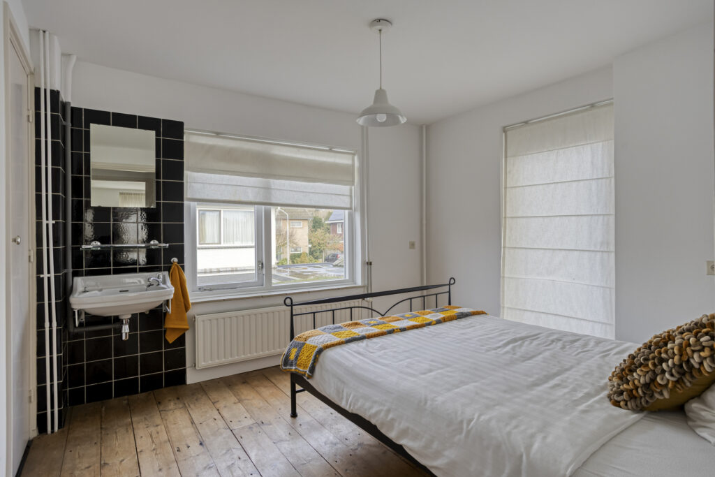 – Slaapkamer I (ca. 17 m²): Royale ouderslaapkamer aan de achterzijde, voorzien van planken vloer, inbouwkast, ruime kastenwand, dubbele deuren naar het plat dak en stucwerk wand- en plafondafwerking.