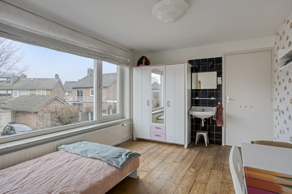 – Slaapkamer III (ca. 12 m²): Eveneens aan de voorzijde, thans in gebruik als werkkamer, met planken vloer, twee vaste inbouwkasten en stucwerk afwerking.
