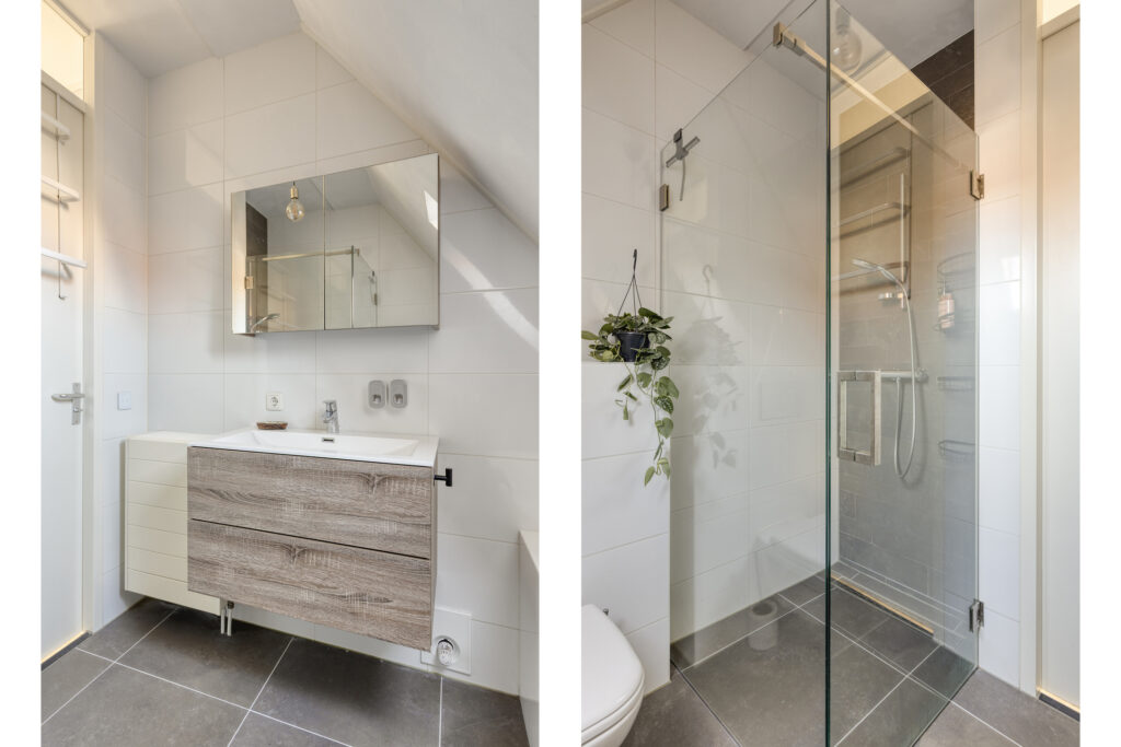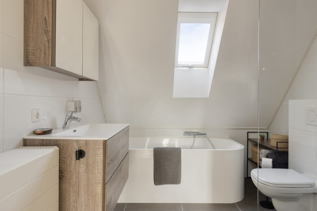 De badkamer is modern en luxe uitgevoerd en van alle gemakken voorzien. De badkamer beschikt over een inloopdouche met thermostaatkraan en glazen douchewand, een ligbad, een wandcloset en een brede wastafel met badmeubel. Ventilatie vindt plaats via mechanische ventilatie en een dakraam. In de badkamer ligt tevens vloerverwarming waardoor het extra comfortabel is tijdens de koudere maanden.