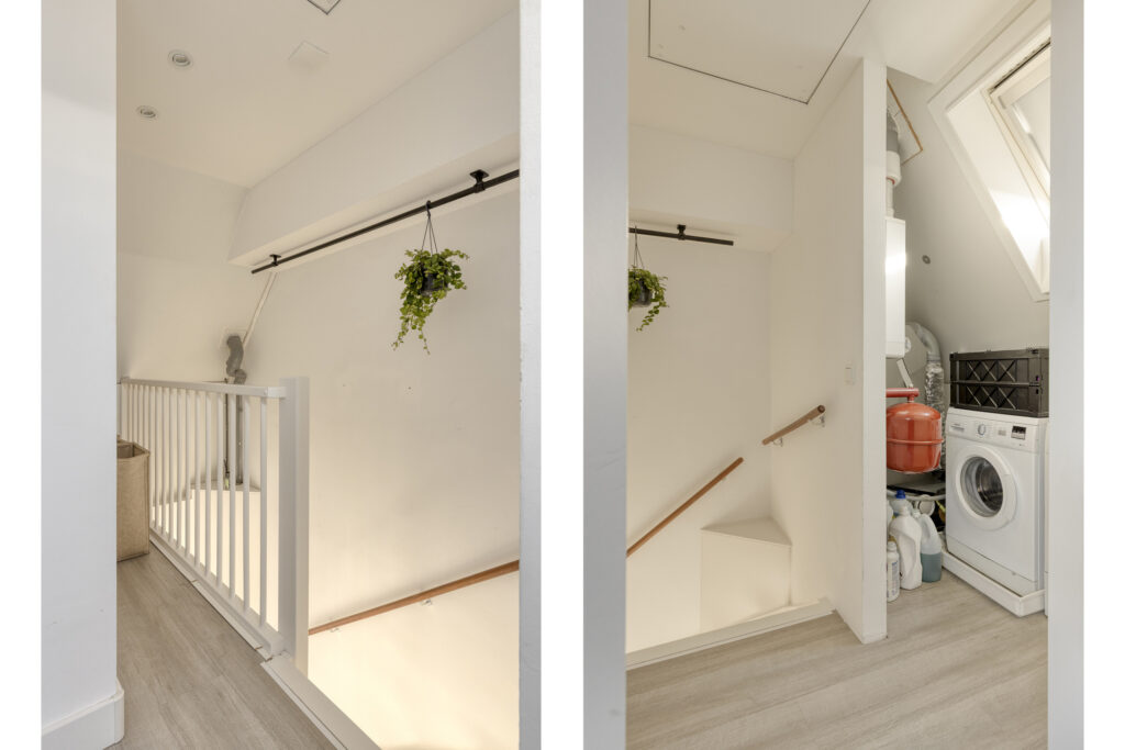 Via een vaste trap is de tweede verdieping bereikbaar. Op de overloop bevinden zich de aansluitingen voor wasapparatuur en de cv-installatie. Dankzij het aanwezige dakraam is hier tevens natuurlijke ventilatie mogelijk.